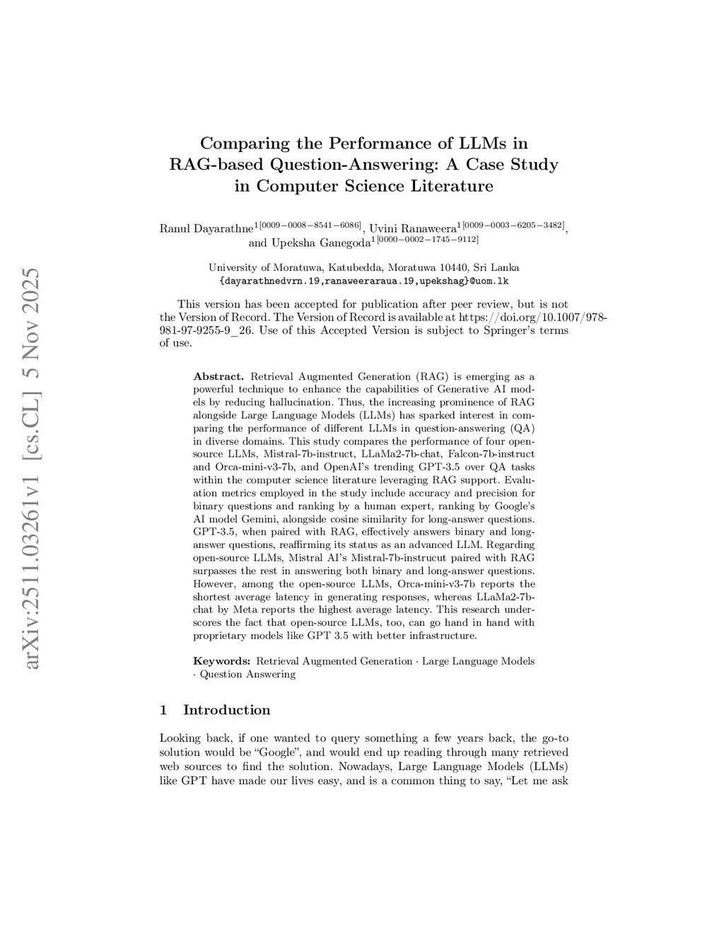 Retrieval Augmented Generation (RAG) is emerging as a powerful technique to enhance the capabilities of Generative AI models by reducing hallucination. Thus, the increasing prominence of RAG alongside Large Language Models (LLMs) has sparked interest in comparing the performance of different LLMs in question-answering (QA) in diverse domains. This study compares the performance of four open-source LLMs, Mistral-7b-instruct, LLaMa2-7b-chat, Falcon-7b-instruct and Orca-mini-v3-7b, and OpenAI's trending GPT-3.5 over QA tasks within the computer science literature leveraging RAG support. Evaluation metrics employed in the study include accuracy and precision for binary questions and ranking by a human expert, ranking by Google's AI model Gemini, alongside cosine similarity for long-answer questions. GPT-3.5, when paired with RAG, effectively answers binary and long-answer questions, reaffirming its status as an advanced LLM. Regarding open-source LLMs, Mistral AI's Mistral-7b-instruct paired with RAG surpasses the rest in answering both binary and long-answer questions. However, among the open-source LLMs, Orca-mini-v3-7b reports the shortest average latency in generating responses, whereas LLaMa2-7b-chat by Meta reports the highest average latency. This research underscores the fact that open-source LLMs, too, can go hand in hand with proprietary models like GPT-3.5 with better infrastructure.
