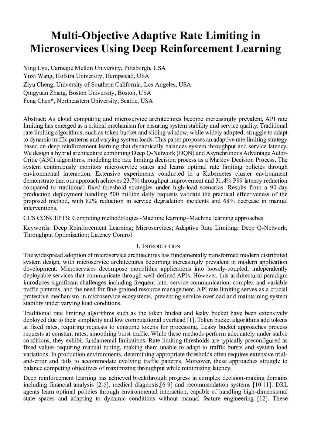 As cloud computing and microservice architectures become increasingly prevalent, API rate limiting has emerged as a critical mechanism for ensuring system stability and service quality. Traditional rate limiting algorithms, such as token bucket and sliding window, while widely adopted, struggle to adapt to dynamic traffic patterns and varying system loads. This paper proposes an adaptive rate limiting strategy based on deep reinforcement learning that dynamically balances system throughput and service latency. We design a hybrid architecture combining Deep Q-Network (DQN) and Asynchronous Advantage Actor-Critic (A3C) algorithms, modeling the rate limiting decision process as a Markov Decision Process. The system continuously monitors microservice states and learns optimal rate limiting policies through environmental interaction. Extensive experiments conducted in a Kubernetes cluster environment demonstrate that our approach achieves 23.7% throughput improvement and 31.4% P99 latency reduction compared to traditional fixed-threshold strategies under high-load scenarios. Results from a 90-day production deployment handling 500 million daily requests validate the practical effectiveness of the proposed method, with 82% reduction in service degradation incidents and 68% decrease in manual interventions.