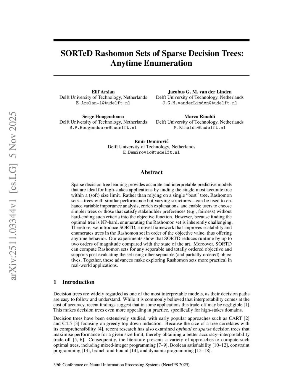 Sparse decision tree learning provides accurate and interpretable predictive models that are ideal for high-stakes applications by finding the single most accurate tree within a (soft) size limit. Rather than relying on a single "best" tree, Rashomon sets-trees with similar performance but varying structures-can be used to enhance variable importance analysis, enrich explanations, and enable users to choose simpler trees or those that satisfy stakeholder preferences (e.g., fairness) without hard-coding such criteria into the objective function. However, because finding the optimal tree is NP-hard, enumerating the Rashomon set is inherently challenging. Therefore, we introduce SORTD, a novel framework that improves scalability and enumerates trees in the Rashomon set in order of the objective value, thus offering anytime behavior. Our experiments show that SORTD reduces runtime by up to two orders of magnitude compared with the state of the art. Moreover, SORTD can compute Rashomon sets for any separable and totally ordered objective and supports post-evaluating the set using other separable (and partially ordered) objectives. Together, these advances make exploring Rashomon sets more practical in real-world applications.