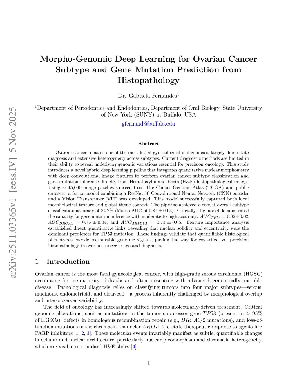 Ovarian cancer remains one of the most lethal gynecological malignancies, largely due to late diagnosis and extensive heterogeneity across subtypes. Current diagnostic methods are limited in their ability to reveal underlying genomic variations essential for precision oncology. This study introduces a novel hybrid deep learning pipeline that integrates quantitative nuclear morphometry with deep convolutional image features to perform ovarian cancer subtype classification and gene mutation inference directly from Hematoxylin and Eosin (H&E) histopathological images. Using image patches sourced from The Cancer Genome Atlas (TCGA) and public datasets, a fusion model combining a ResNet-50 Convolutional Neural Network (CNN) encoder and a Vision Transformer (ViT) was developed. This model successfully captured both local morphological texture and global tissue context. The pipeline achieved a robust overall subtype classification accuracy of (Macro AUC of ). Crucially, the model demonstrated the capacity for gene mutation inference with moderate-to-high accuracy: , , and . Feature importance analysis established direct quantitative links, revealing that nuclear solidity and eccentricity were the dominant predictors for TP53 mutation. These findings validate that quantifiable histological phenotypes encode measurable genomic signals, paving the way for cost-effective, precision histopathology in ovarian cancer triage and diagnosis.