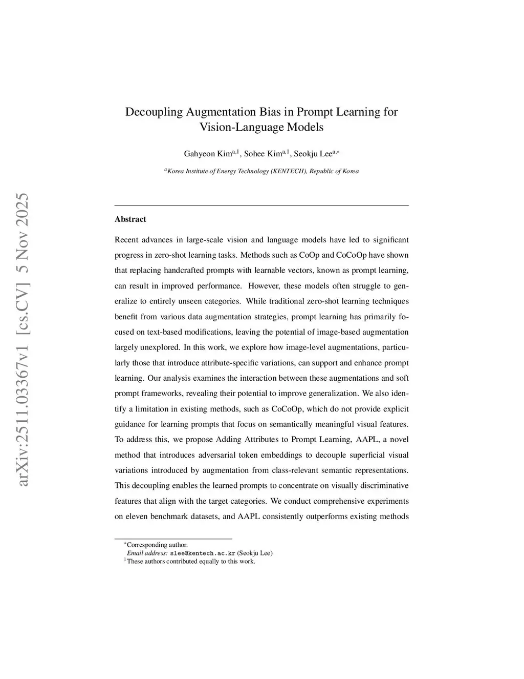 Recent advances in large-scale vision and language models have led to significant progress in zero-shot learning tasks. Methods such as CoOp and CoCoOp have shown that replacing handcrafted prompts with learnable vectors, known as prompt learning, can result in improved performance. However, these models often struggle to generalize to entirely unseen categories. While traditional zero-shot learning techniques benefit from various data augmentation strategies, prompt learning has primarily focused on text-based modifications, leaving the potential of image-based augmentation largely unexplored. In this work, we explore how image-level augmentations, particularly those that introduce attribute-specific variations, can support and enhance prompt learning. Our analysis examines the interaction between these augmentations and soft prompt frameworks, revealing their potential to improve generalization. We also identify a limitation in existing methods, such as CoCoOp, which do not provide explicit guidance for learning prompts that focus on semantically meaningful visual features. To address this, we propose Adding Attributes to Prompt Learning, AAPL, a novel method that introduces adversarial token embeddings to decouple superficial visual variations introduced by augmentation from class-relevant semantic representations. This decoupling enables the learned prompts to concentrate on visually discriminative features that align with the target categories. We conduct comprehensive experiments on eleven benchmark datasets, and AAPL consistently outperforms existing methods across few-shot, zero-shot, cross-dataset, and domain generalization settings. Our source code is publicly available at:this https URL