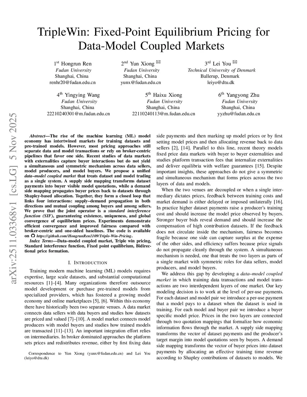 TripleWin: Fixed-Point Equilibrium Pricing for Data-Model Coupled Markets