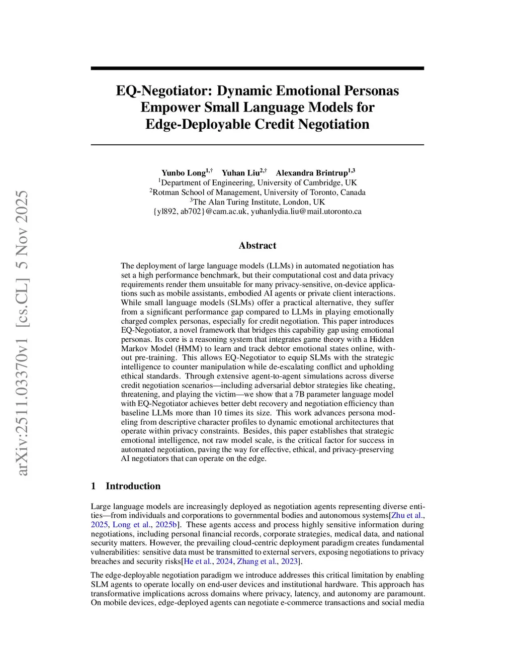 The deployment of large language models (LLMs) in automated negotiation has set a high performance benchmark, but their computational cost and data privacy requirements render them unsuitable for many privacy-sensitive, on-device applications such as mobile assistants, embodied AI agents or private client interactions. While small language models (SLMs) offer a practical alternative, they suffer from a significant performance gap compared to LLMs in playing emotionally charged complex personas, especially for credit negotiation. This paper introduces EQ-Negotiator, a novel framework that bridges this capability gap using emotional personas. Its core is a reasoning system that integrates game theory with a Hidden Markov Model(HMM) to learn and track debtor emotional states online, without pre-training. This allows EQ-Negotiator to equip SLMs with the strategic intelligence to counter manipulation while de-escalating conflict and upholding ethical standards. Through extensive agent-to-agent simulations across diverse credit negotiation scenarios, including adversarial debtor strategies like cheating, threatening, and playing the victim, we show that a 7B parameter language model with EQ-Negotiator achieves better debt recovery and negotiation efficiency than baseline LLMs more than 10 times its size. This work advances persona modeling from descriptive character profiles to dynamic emotional architectures that operate within privacy constraints. Besides, this paper establishes that strategic emotional intelligence, not raw model scale, is the critical factor for success in automated negotiation, paving the way for effective, ethical, and privacy-preserving AI negotiators that can operate on the edge.