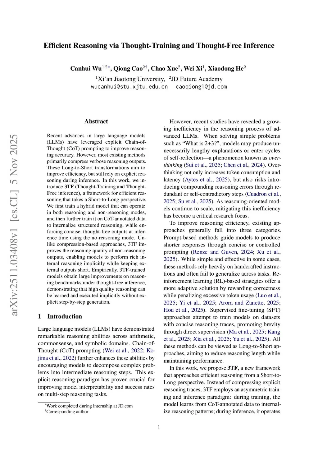 Recent advances in large language models (LLMs) have leveraged explicit Chain-of-Thought (CoT) prompting to improve reasoning accuracy. However, most existing methods primarily focus on compressing verbose reasoning outputs. These Long-to-Short transformations aim to improve efficiency, but require a large amount of short CoT data. In this work, we introduce \textbf{3TF} (\textbf{T}hought-\textbf{T}raining and \textbf{T}hought-\textbf{F}ree inference), a framework for efficient reasoning that takes a Short-to-Long perspective. We first train a hybrid model that can operate in both reasoning and non-reasoning modes, and then further train it on CoT-annotated data to internalize structured reasoning, while enforcing concise, thought-free outputs at inference time using the no-reasoning mode. Unlike compression-based approaches, 3TF improves the reasoning quality of non-reasoning outputs, enabling models to perform rich internal reasoning implicitly while keeping external outputs short. Empirically, 3TF-trained models obtain large improvements on reasoning benchmarks under thought-free inference, demonstrating that high quality reasoning can be learned and executed implicitly without explicit step-by-step generation.