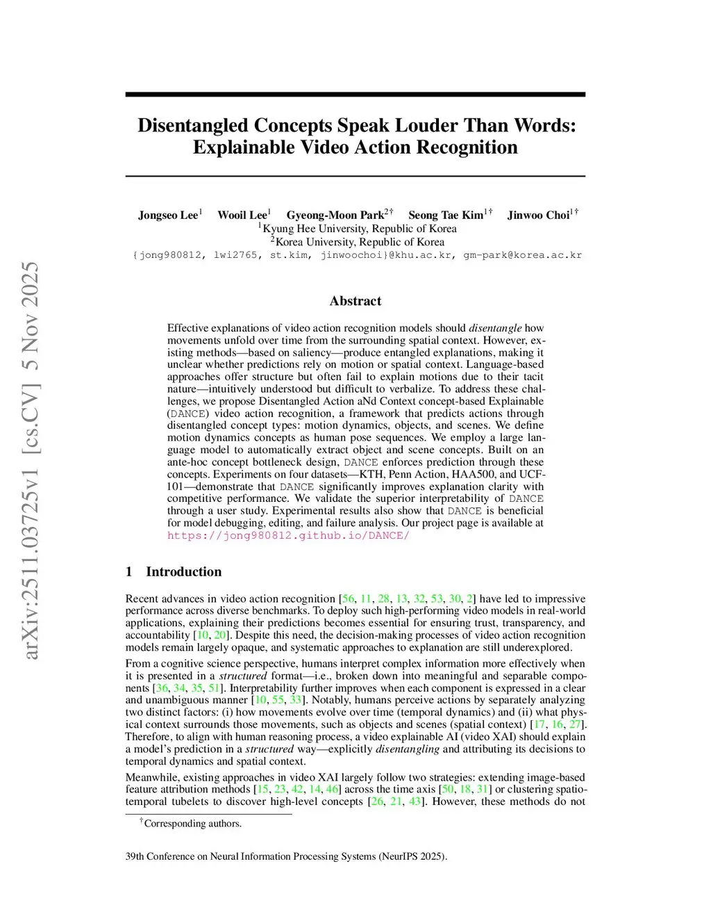 Effective explanations of video action recognition models should disentangle how movements unfold over time from the surrounding spatial context. However, existing methods based on saliency produce entangled explanations, making it unclear whether predictions rely on motion or spatial context. Language-based approaches offer structure but often fail to explain motions due to their tacit nature -- intuitively understood but difficult to verbalize. To address these challenges, we propose Disentangled Action aNd Context concept-based Explainable (DANCE) video action recognition, a framework that predicts actions through disentangled concept types: motion dynamics, objects, and scenes. We define motion dynamics concepts as human pose sequences. We employ a large language model to automatically extract object and scene concepts. Built on an ante-hoc concept bottleneck design, DANCE enforces prediction through these concepts. Experiments on four datasets -- KTH, Penn Action, HAA500, and UCF-101 -- demonstrate that DANCE significantly improves explanation clarity with competitive performance. We validate the superior interpretability of DANCE through a user study. Experimental results also show that DANCE is beneficial for model debugging, editing, and failure analysis.