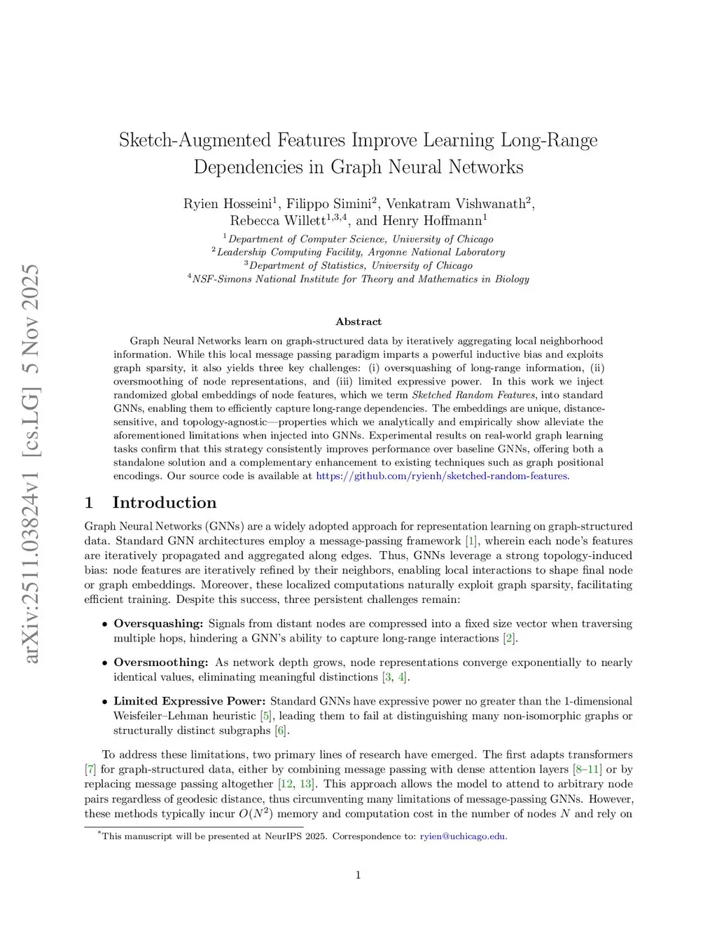 Graph Neural Networks learn on graph-structured data by iteratively aggregating local neighborhood information. While this local message passing paradigm imparts a powerful inductive bias and exploits graph sparsity, it also yields three key challenges: (i) oversquashing of long-range information, (ii) oversmoothing of node representations, and (iii) limited expressive power. In this work we inject randomized global embeddings of node features, which we term \textit{Sketched Random Features}, into standard GNNs, enabling them to efficiently capture long-range dependencies. The embeddings are unique, distance-sensitive, and topology-agnostic -- properties which we analytically and empirically show alleviate the aforementioned limitations when injected into GNNs. Experimental results on real-world graph learning tasks confirm that this strategy consistently improves performance over baseline GNNs, offering both a standalone solution and a complementary enhancement to existing techniques such as graph positional encodings. Our source code is available at \href{this https URL}{this https URL}.