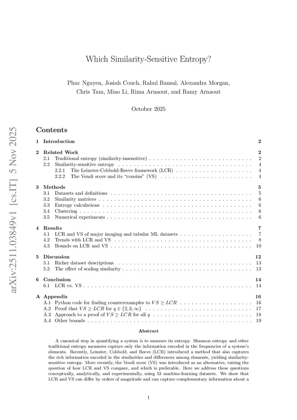 Shannon entropy is not the only entropy that is relevant to machine-learning datasets, nor possibly even the most important one. Traditional entropies such as Shannon entropy capture information represented by elements' frequencies but not the richer information encoded by their similarities and differences. Capturing the latter requires similarity-sensitive entropy (``sentropy''). Sentropy can be measured using either the recently developed Leinster-Cobbold-Reeve framework (LCR) or the newer Vendi score (VS). This raises the practical question of which one to use: LCR or VS. Here we address this question theoretically and numerically, using 53 large and well-known imaging and tabular datasets. We find that LCR and VS values can differ by orders of magnitude and are complementary, except in limiting cases. We show that both LCR and VS results depend on how similarities are scaled, and introduce the notion of ``half-distance'' to parameterize this dependence. We prove the VS provides an upper bound on LCR for all non-negative values of the Rényi-Hill order parameter, as well as for negative values in the special case that the similarity matrix is full rank. We conclude that VS is preferable only when a dataset's elements can be usefully interpreted as linear combinations of a more fundamental set of ``ur-elements'' or when the system that the dataset describes has a quantum-mechanical character. In the broader case where one simply wishes to capture the rich information encoded by elements' similarities and differences as well as their frequencies, we propose that LCR should be favored; nevertheless, for certain half-distances the two methods can complement each other.