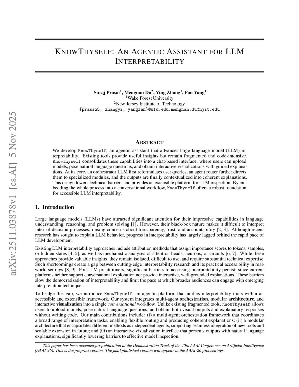 We develop KnowThyself, an agentic assistant that advances large language model (LLM) interpretability. Existing tools provide useful insights but remain fragmented and code-intensive. KnowThyself consolidates these capabilities into a chat-based interface, where users can upload models, pose natural language questions, and obtain interactive visualizations with guided explanations. At its core, an orchestrator LLM first reformulates user queries, an agent router further directs them to specialized modules, and the outputs are finally contextualized into coherent explanations. This design lowers technical barriers and provides an extensible platform for LLM inspection. By embedding the whole process into a conversational workflow, KnowThyself offers a robust foundation for accessible LLM interpretability.