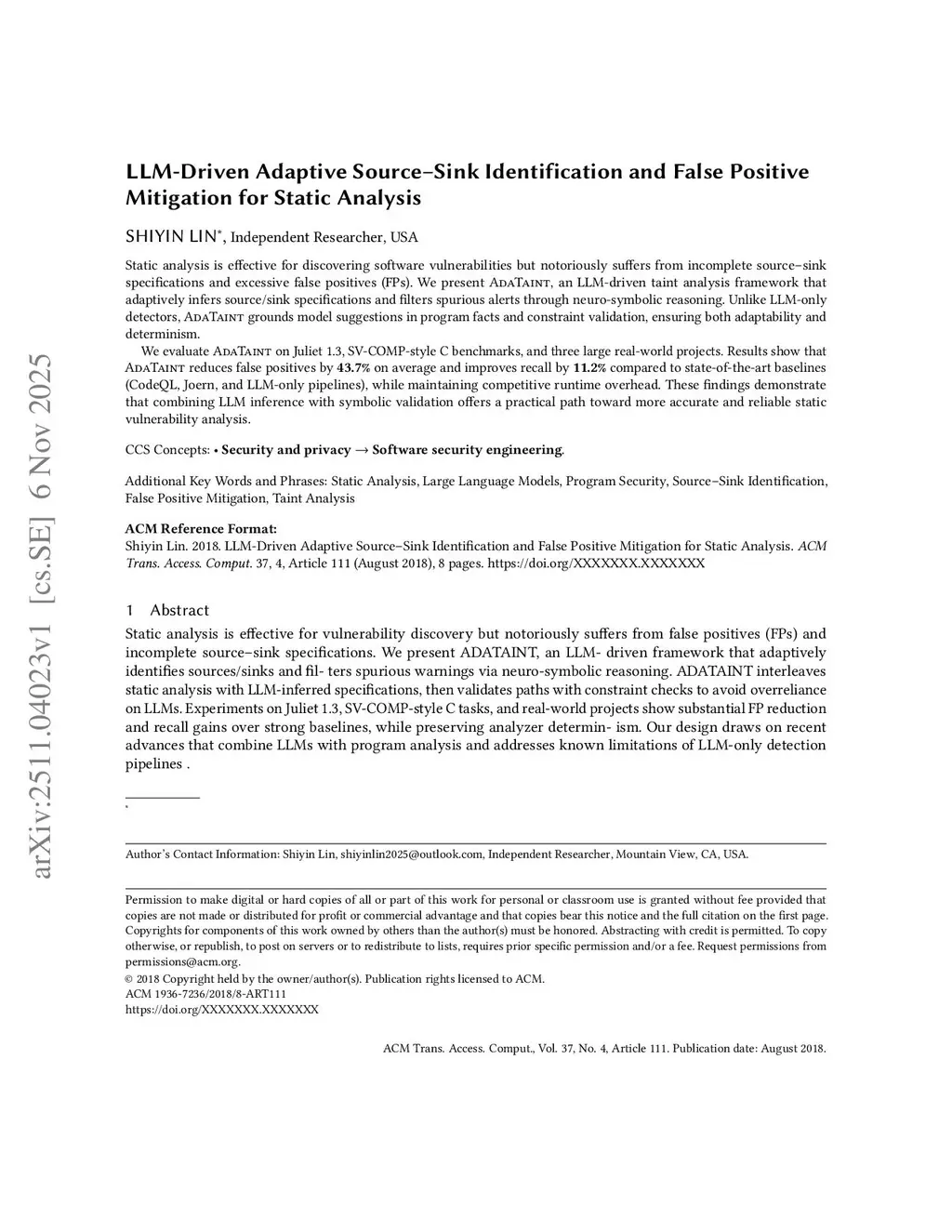 LLM-Driven Adaptive Source-Sink Identification and False Positive Mitigation for Static Analysis