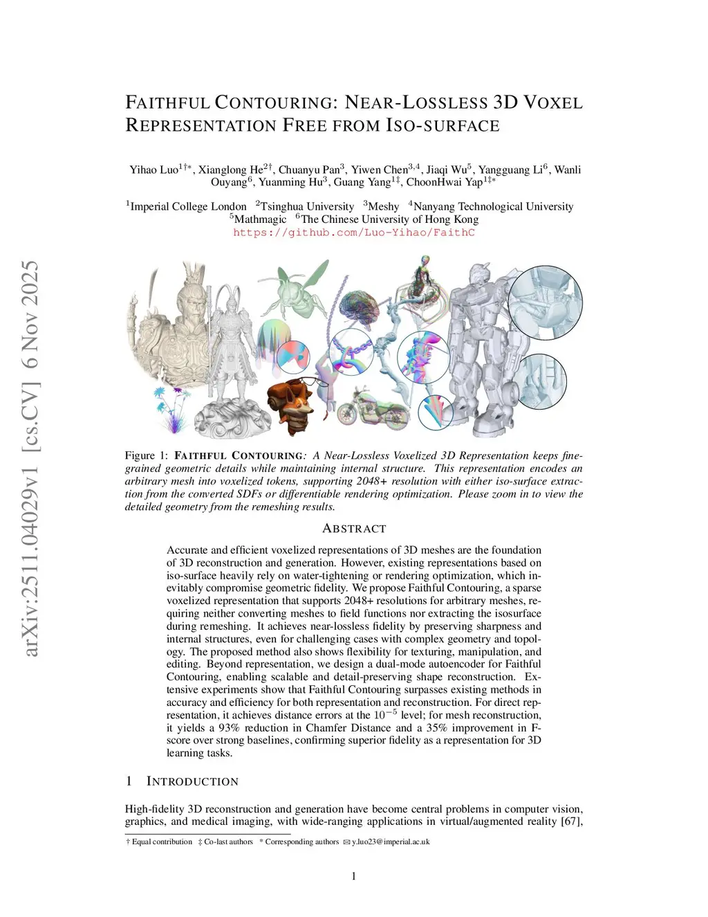 Accurate and efficient voxelized representations of 3D meshes are the foundation of 3D reconstruction and generation. However, existing representations based on iso-surface heavily rely on water-tightening or rendering optimization, which inevitably compromise geometric fidelity. We propose Faithful Contouring, a sparse voxelized representation that supports 2048+ resolutions for arbitrary meshes, requiring neither converting meshes to field functions nor extracting the isosurface during remeshing. It achieves near-lossless fidelity by preserving sharpness and internal structures, even for challenging cases with complex geometry and topology. The proposed method also shows flexibility for texturing, manipulation, and editing. Beyond representation, we design a dual-mode autoencoder for Faithful Contouring, enabling scalable and detail-preserving shape reconstruction. Extensive experiments show that Faithful Contouring surpasses existing methods in accuracy and efficiency for both representation and reconstruction. For direct representation, it achieves distance errors at the level; for mesh reconstruction, it yields a 93\% reduction in Chamfer Distance and a 35\% improvement in F-score over strong baselines, confirming superior fidelity as a representation for 3D learning tasks.