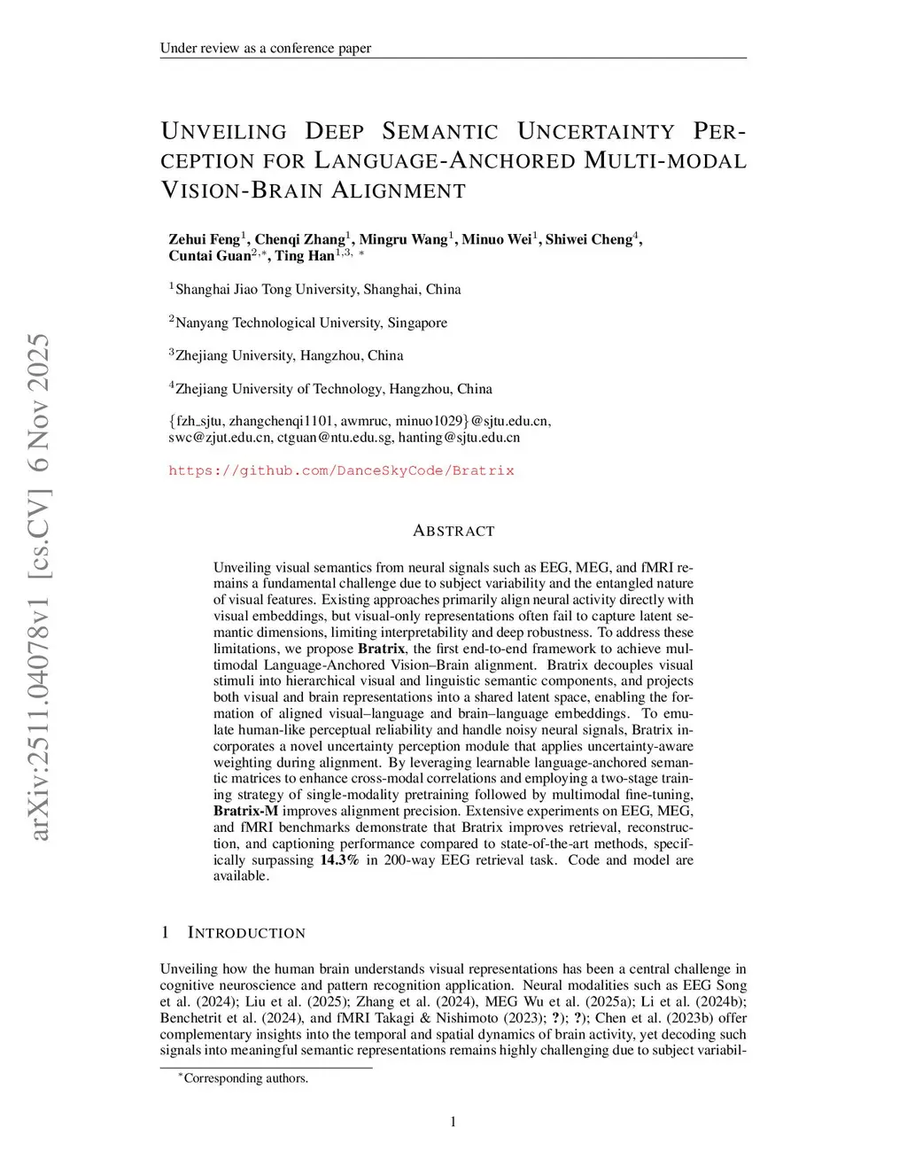 Unveiling visual semantics from neural signals such as EEG, MEG, and fMRI remains a fundamental challenge due to subject variability and the entangled nature of visual features. Existing approaches primarily align neural activity directly with visual embeddings, but visual-only representations often fail to capture latent semantic dimensions, limiting interpretability and deep robustness. To address these limitations, we propose Bratrix, the first end-to-end framework to achieve multimodal Language-Anchored Vision-Brain alignment. Bratrix decouples visual stimuli into hierarchical visual and linguistic semantic components, and projects both visual and brain representations into a shared latent space, enabling the formation of aligned visual-language and brain-language embeddings. To emulate human-like perceptual reliability and handle noisy neural signals, Bratrix incorporates a novel uncertainty perception module that applies uncertainty-aware weighting during alignment. By leveraging learnable language-anchored semantic matrices to enhance cross-modal correlations and employing a two-stage training strategy of single-modality pretraining followed by multimodal fine-tuning, Bratrix-M improves alignment precision. Extensive experiments on EEG, MEG, and fMRI benchmarks demonstrate that Bratrix improves retrieval, reconstruction, and captioning performance compared to state-of-the-art methods, specifically surpassing 14.3% in 200-way EEG retrieval task. Code and model are available.