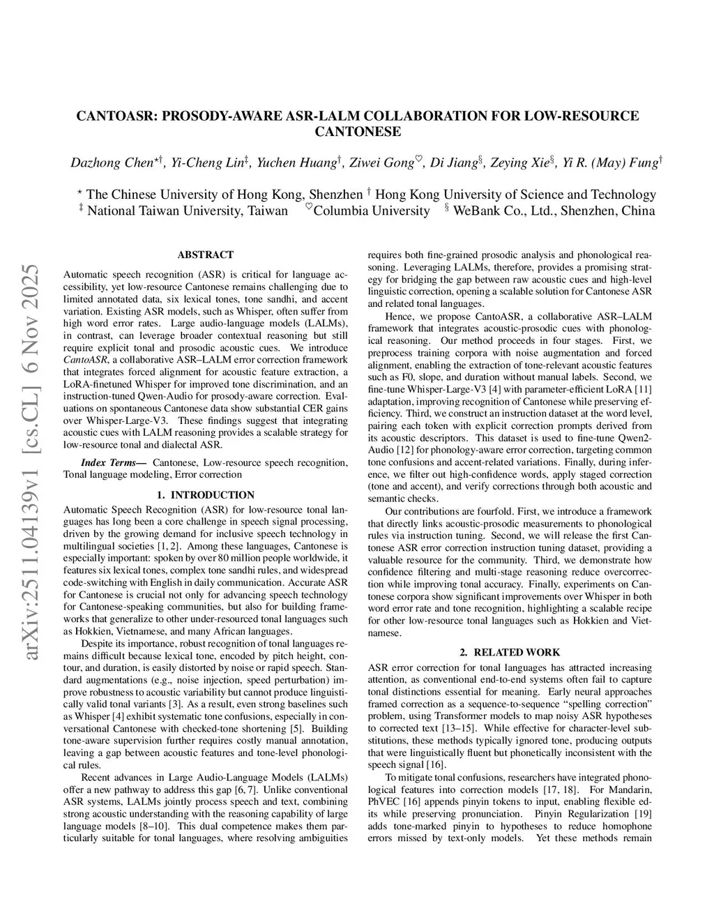 Automatic speech recognition (ASR) is critical for language accessibility, yet low-resource Cantonese remains challenging due to limited annotated data, six lexical tones, tone sandhi, and accent variation. Existing ASR models, such as Whisper, often suffer from high word error rates. Large audio-language models (LALMs), in contrast, can leverage broader contextual reasoning but still require explicit tonal and prosodic acoustic cues. We introduce CantoASR, a collaborative ASR-LALM error correction framework that integrates forced alignment for acoustic feature extraction, a LoRA-finetuned Whisper for improved tone discrimination, and an instruction-tuned Qwen-Audio for prosody-aware correction. Evaluations on spontaneous Cantonese data show substantial CER gains over Whisper-Large-V3. These findings suggest that integrating acoustic cues with LALM reasoning provides a scalable strategy for low-resource tonal and dialectal ASR.