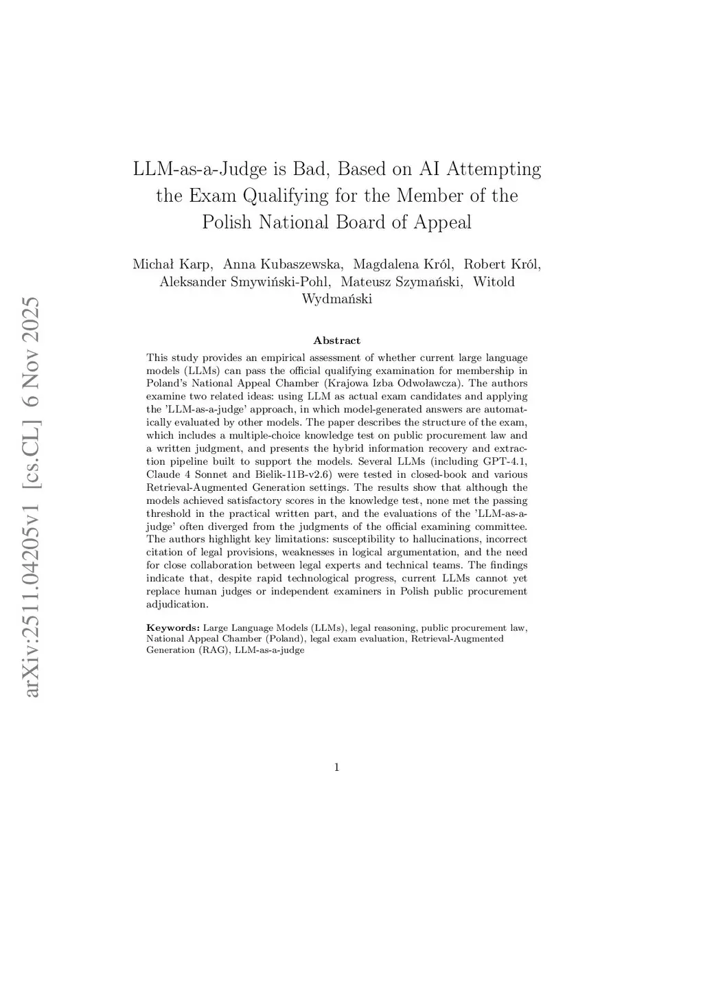 This study provides an empirical assessment of whether current large language models (LLMs) can pass the official qualifying examination for membership in Poland's National Appeal Chamber (Krajowa Izba Odwoławcza). The authors examine two related ideas: using LLM as actual exam candidates and applying the 'LLM-as-a-judge' approach, in which model-generated answers are automatically evaluated by other models. The paper describes the structure of the exam, which includes a multiple-choice knowledge test on public procurement law and a written judgment, and presents the hybrid information recovery and extraction pipeline built to support the models. Several LLMs (including GPT-4.1, Claude 4 Sonnet and Bielik-11B-v2.6) were tested in closed-book and various Retrieval-Augmented Generation settings. The results show that although the models achieved satisfactory scores in the knowledge test, none met the passing threshold in the practical written part, and the evaluations of the 'LLM-as-a-judge' often diverged from the judgments of the official examining committee. The authors highlight key limitations: susceptibility to hallucinations, incorrect citation of legal provisions, weaknesses in logical argumentation, and the need for close collaboration between legal experts and technical teams. The findings indicate that, despite rapid technological progress, current LLMs cannot yet replace human judges or independent examiners in Polish public procurement adjudication.