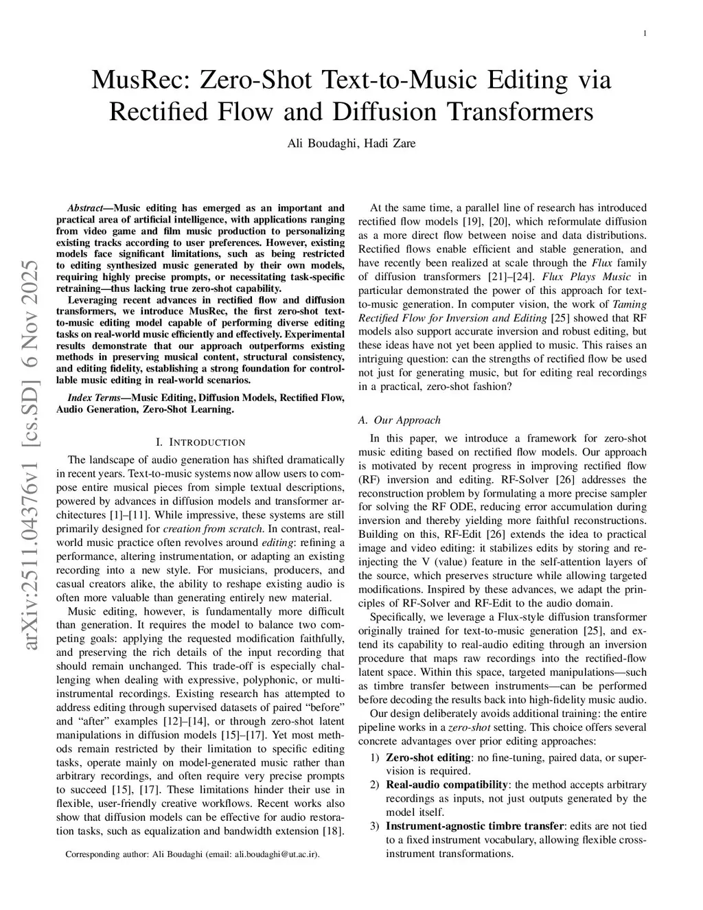 Music editing has emerged as an important and practical area of artificial intelligence, with applications ranging from video game and film music production to personalizing existing tracks according to user preferences. However, existing models face significant limitations, such as being restricted to editing synthesized music generated by their own models, requiring highly precise prompts, or necessitating task-specific retraining, thus lacking true zero-shot capability. leveraging recent advances in rectified flow and diffusion transformers, we introduce MusRec, a zero-shot text-to-music editing model capable of performing diverse editing tasks on real-world music efficiently and effectively. Experimental results demonstrate that our approach outperforms existing methods in preserving musical content, structural consistency, and editing fidelity, establishing a strong foundation for controllable music editing in real-world scenarios.