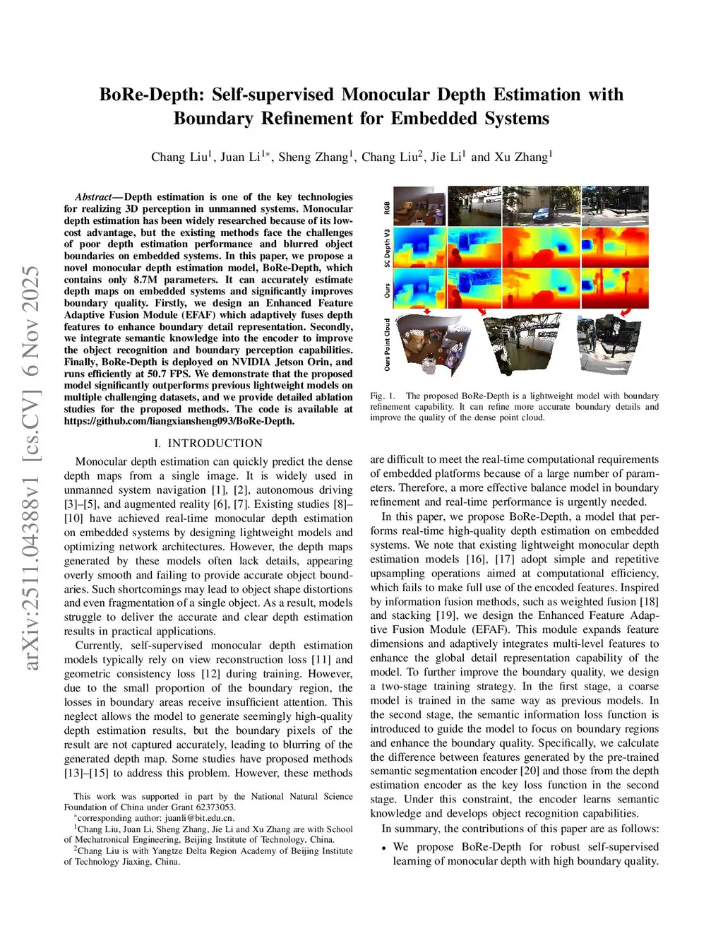 BoRe-Depth: Self-supervised Monocular Depth Estimation with Boundary Refinement for Embedded Systems