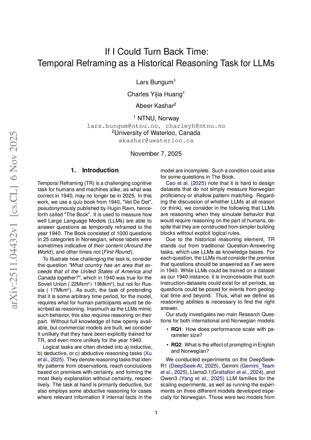 In this study, we experiment with the ability of LLMs to do temporal reasoning. Using a Norwegian book from 1940 containing trivia questions, we prompt the LLMs to answer the questions as if it were 1940. We also pose the questions in both English and Norwegian. Correct answers are often presented as sentences, and grading is done by means of LLM-as-judge, with sampled checks by a native speaker. Prompting in English consistently gave better results than in Norwegian, an unexpected result. In contrast, using larger LLMs improved results. We tested the DeepSeek-R1, Gemma3, Qwen3, and Llama3.1 model families, and also the largest available LLM especially crafted for Norwegian.