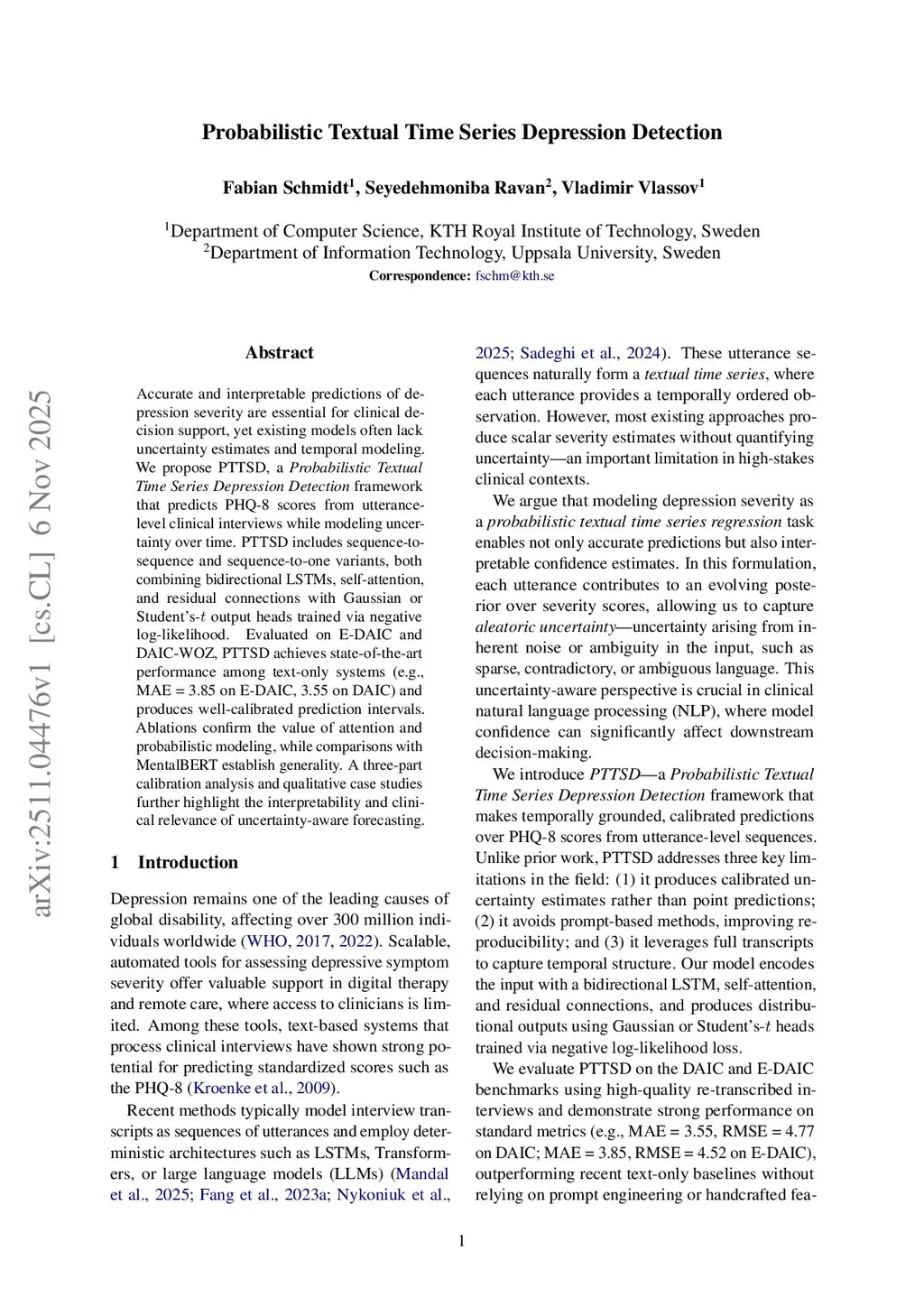 Accurate and interpretable predictions of depression severity are essential for clinical decision support, yet existing models often lack uncertainty estimates and temporal modeling. We propose PTTSD, a Probabilistic Textual Time Series Depression Detection framework that predicts PHQ-8 scores from utterance-level clinical interviews while modeling uncertainty over time. PTTSD includes sequence-to-sequence and sequence-to-one variants, both combining bidirectional LSTMs, self-attention, and residual connections with Gaussian or Student-t output heads trained via negative log-likelihood. Evaluated on E-DAIC and DAIC-WOZ, PTTSD achieves state-of-the-art performance among text-only systems (e.g., MAE = 3.85 on E-DAIC, 3.55 on DAIC) and produces well-calibrated prediction intervals. Ablations confirm the value of attention and probabilistic modeling, while comparisons with MentalBERT establish generality. A three-part calibration analysis and qualitative case studies further highlight the interpretability and clinical relevance of uncertainty-aware forecasting.