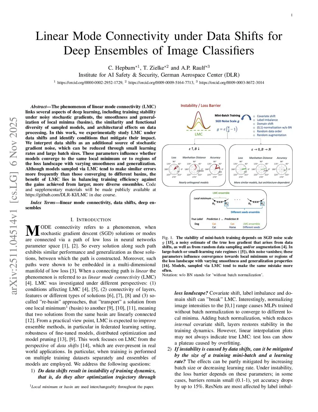 The phenomenon of linear mode connectivity (LMC) links several aspects of deep learning, including training stability under noisy stochastic gradients, the smoothness and generalization of local minima (basins), the similarity and functional diversity of sampled models, and architectural effects on data processing. In this work, we experimentally study LMC under data shifts and identify conditions that mitigate their impact. We interpret data shifts as an additional source of stochastic gradient noise, which can be reduced through small learning rates and large batch sizes. These parameters influence whether models converge to the same local minimum or to regions of the loss landscape with varying smoothness and generalization. Although models sampled via LMC tend to make similar errors more frequently than those converging to different basins, the benefit of LMC lies in balancing training efficiency against the gains achieved from larger, more diverse ensembles. Code and supplementary materials will be made publicly available atthis https URLin due course.