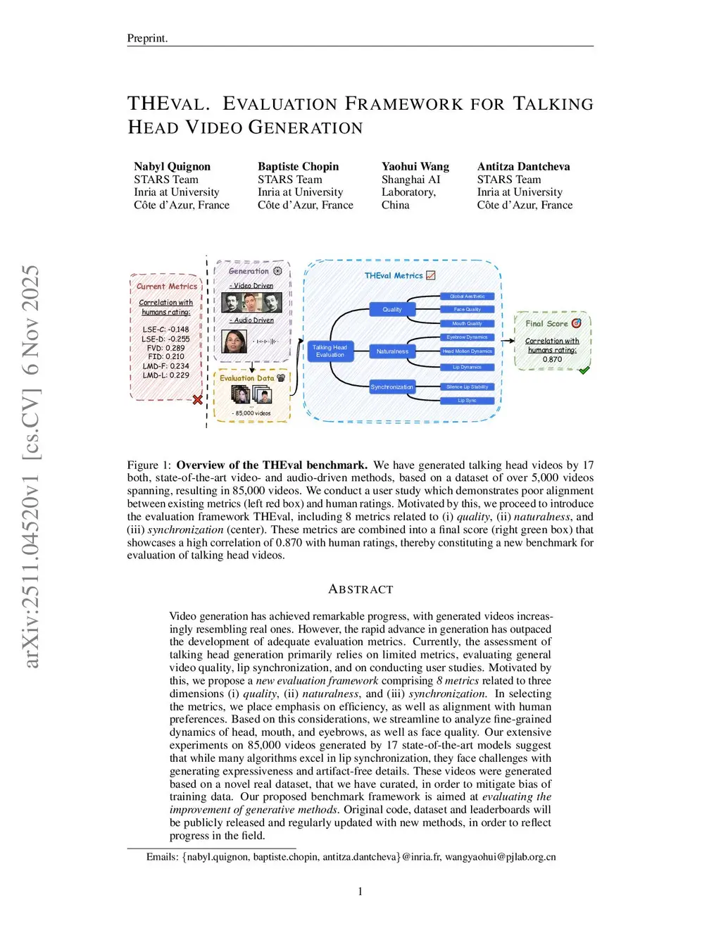 Video generation has achieved remarkable progress, with generated videos increasingly resembling real ones. However, the rapid advance in generation has outpaced the development of adequate evaluation metrics. Currently, the assessment of talking head generation primarily relies on limited metrics, evaluating general video quality, lip synchronization, and on conducting user studies. Motivated by this, we propose a new evaluation framework comprising 8 metrics related to three dimensions (i) quality, (ii) naturalness, and (iii) synchronization. In selecting the metrics, we place emphasis on efficiency, as well as alignment with human preferences. Based on this considerations, we streamline to analyze fine-grained dynamics of head, mouth, and eyebrows, as well as face quality. Our extensive experiments on 85,000 videos generated by 17 state-of-the-art models suggest that while many algorithms excel in lip synchronization, they face challenges with generating expressiveness and artifact-free details. These videos were generated based on a novel real dataset, that we have curated, in order to mitigate bias of training data. Our proposed benchmark framework is aimed at evaluating the improvement of generative methods. Original code, dataset and leaderboards will be publicly released and regularly updated with new methods, in order to reflect progress in the field.