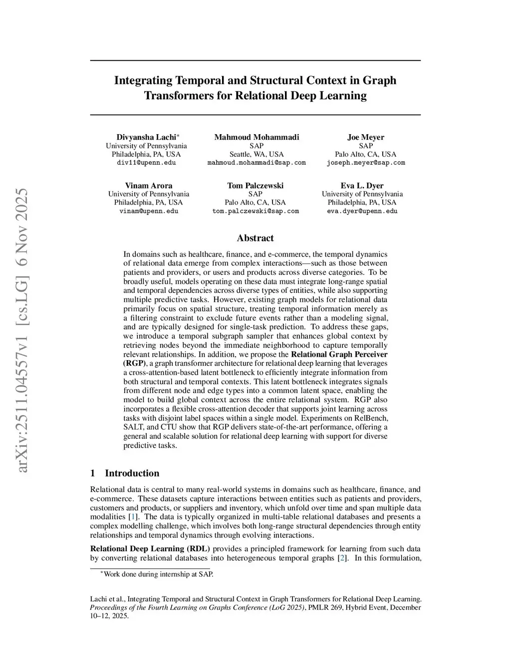 In domains such as healthcare, finance, and e-commerce, the temporal dynamics of relational data emerge from complex interactions-such as those between patients and providers, or users and products across diverse categories. To be broadly useful, models operating on these data must integrate long-range spatial and temporal dependencies across diverse types of entities, while also supporting multiple predictive tasks. However, existing graph models for relational data primarily focus on spatial structure, treating temporal information merely as a filtering constraint to exclude future events rather than a modeling signal, and are typically designed for single-task prediction. To address these gaps, we introduce a temporal subgraph sampler that enhances global context by retrieving nodes beyond the immediate neighborhood to capture temporally relevant relationships. In addition, we propose the Relational Graph Perceiver (RGP), a graph transformer architecture for relational deep learning that leverages a cross-attention-based latent bottleneck to efficiently integrate information from both structural and temporal contexts. This latent bottleneck integrates signals from different node and edge types into a common latent space, enabling the model to build global context across the entire relational system. RGP also incorporates a flexible cross-attention decoder that supports joint learning across tasks with disjoint label spaces within a single model. Experiments on RelBench, SALT, and CTU show that RGP delivers state-of-the-art performance, offering a general and scalable solution for relational deep learning with support for diverse predictive tasks.