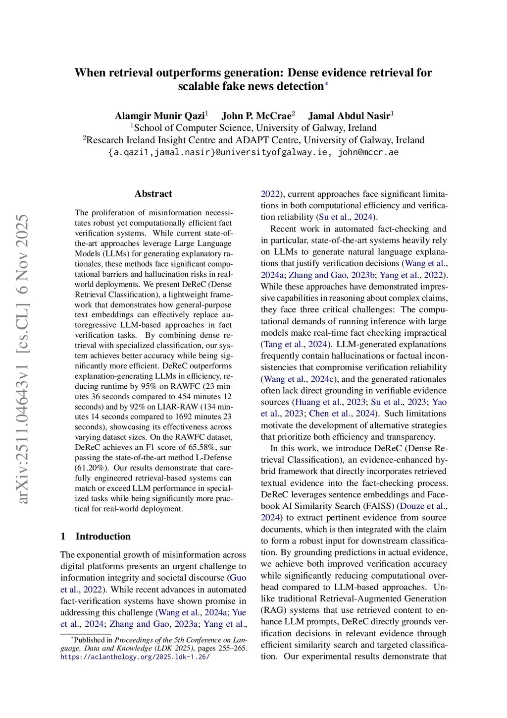 When retrieval outperforms generation: Dense evidence retrieval for scalable fake news detection