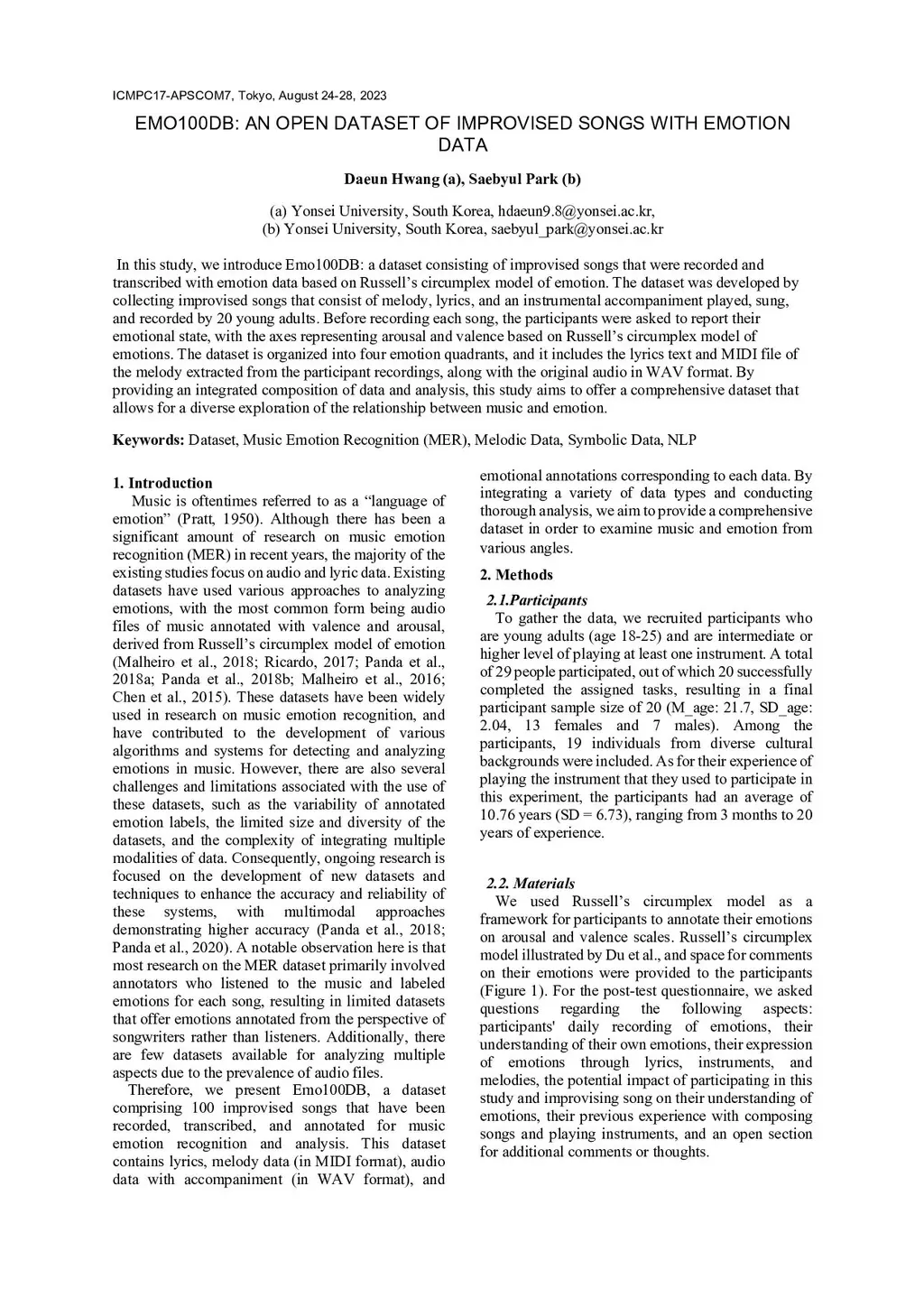 EMO100DB: An Open Dataset of Improvised Songs with Emotion Data