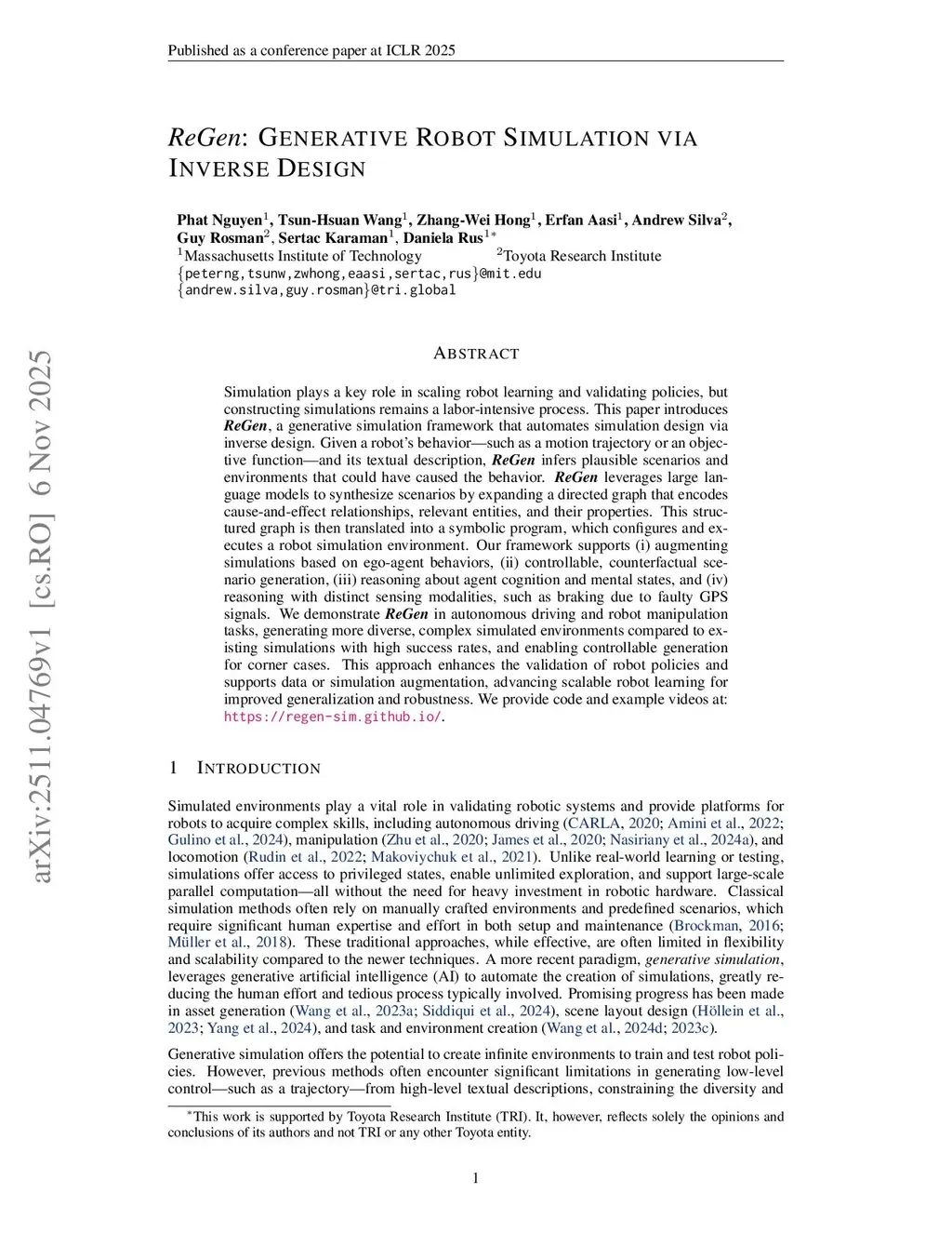 Simulation plays a key role in scaling robot learning and validating policies, but constructing simulations remains a labor-intensive process. This paper introduces ReGen, a generative simulation framework that automates simulation design via inverse design. Given a robot's behavior -- such as a motion trajectory or an objective function -- and its textual description, ReGen infers plausible scenarios and environments that could have caused the behavior. ReGen leverages large language models to synthesize scenarios by expanding a directed graph that encodes cause-and-effect relationships, relevant entities, and their properties. This structured graph is then translated into a symbolic program, which configures and executes a robot simulation environment. Our framework supports (i) augmenting simulations based on ego-agent behaviors, (ii) controllable, counterfactual scenario generation, (iii) reasoning about agent cognition and mental states, and (iv) reasoning with distinct sensing modalities, such as braking due to faulty GPS signals. We demonstrate ReGen in autonomous driving and robot manipulation tasks, generating more diverse, complex simulated environments compared to existing simulations with high success rates, and enabling controllable generation for corner cases. This approach enhances the validation of robot policies and supports data or simulation augmentation, advancing scalable robot learning for improved generalization and robustness. We provide code and example videos at:this https URL
