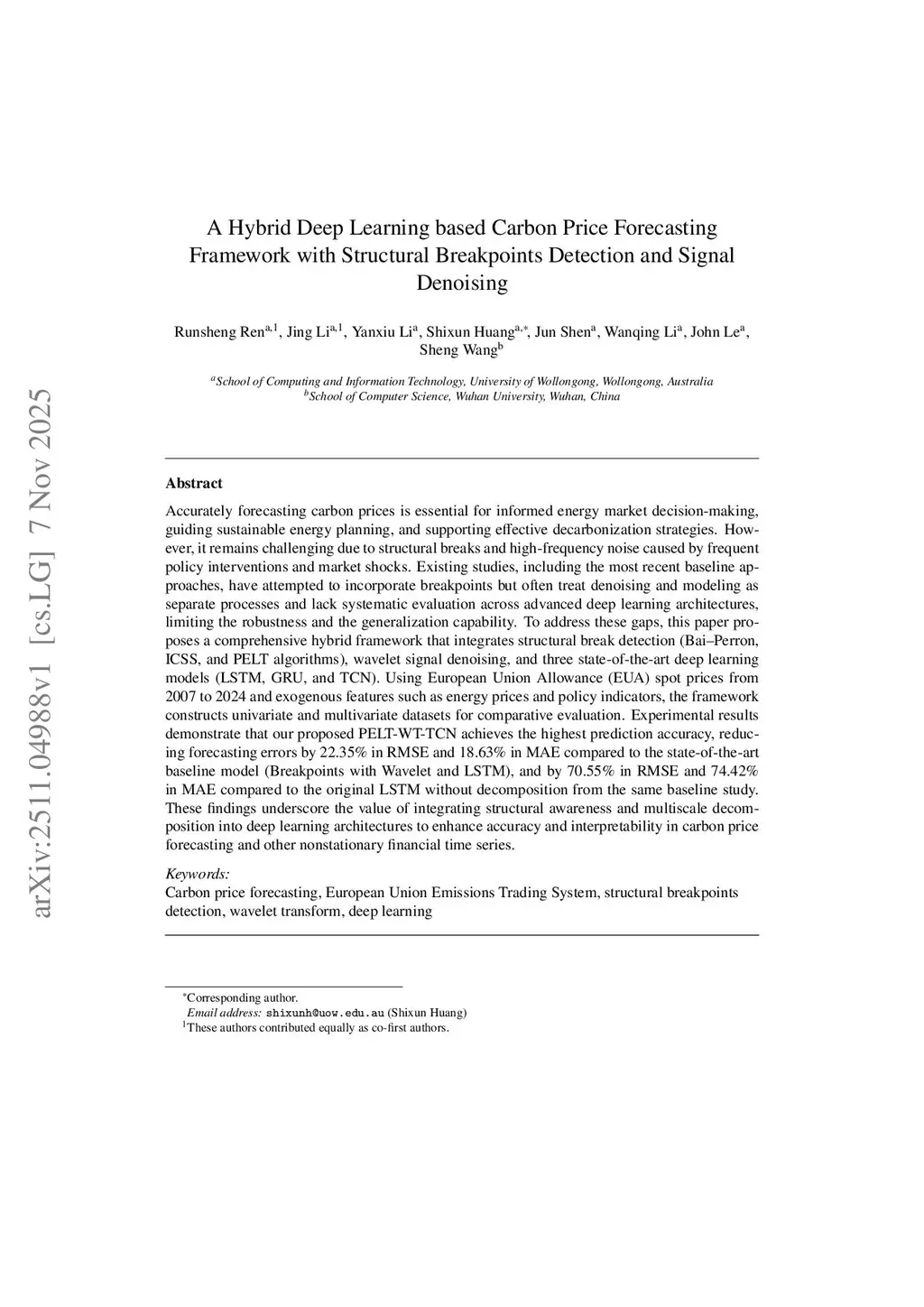 Accurately forecasting carbon prices is essential for informed energy market decision-making, guiding sustainable energy planning, and supporting effective decarbonization strategies. However, it remains challenging due to structural breaks and high-frequency noise caused by frequent policy interventions and market shocks. Existing studies, including the most recent baseline approaches, have attempted to incorporate breakpoints but often treat denoising and modeling as separate processes and lack systematic evaluation across advanced deep learning architectures, limiting the robustness and the generalization capability. To address these gaps, this paper proposes a comprehensive hybrid framework that integrates structural break detection (Bai-Perron, ICSS, and PELT algorithms), wavelet signal denoising, and three state-of-the-art deep learning models (LSTM, GRU, and TCN). Using European Union Allowance (EUA) spot prices from 2007 to 2024 and exogenous features such as energy prices and policy indicators, the framework constructs univariate and multivariate datasets for comparative evaluation. Experimental results demonstrate that our proposed PELT-WT-TCN achieves the highest prediction accuracy, reducing forecasting errors by 22.35% in RMSE and 18.63% in MAE compared to the state-of-the-art baseline model (Breakpoints with Wavelet and LSTM), and by 70.55% in RMSE and 74.42% in MAE compared to the original LSTM without decomposition from the same baseline study. These findings underscore the value of integrating structural awareness and multiscale decomposition into deep learning architectures to enhance accuracy and interpretability in carbon price forecasting and other nonstationary financial time series.