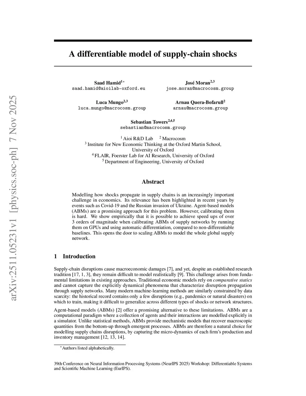 Modelling how shocks propagate in supply chains is an increasingly important challenge in economics. Its relevance has been highlighted in recent years by events such as Covid-19 and the Russian invasion of Ukraine. Agent-based models (ABMs) are a promising approach for this problem. However, calibrating them is hard. We show empirically that it is possible to achieve speed ups of over 3 orders of magnitude when calibrating ABMs of supply networks by running them on GPUs and using automatic differentiation, compared to non-differentiable baselines. This opens the door to scaling ABMs to model the whole global supply network.
