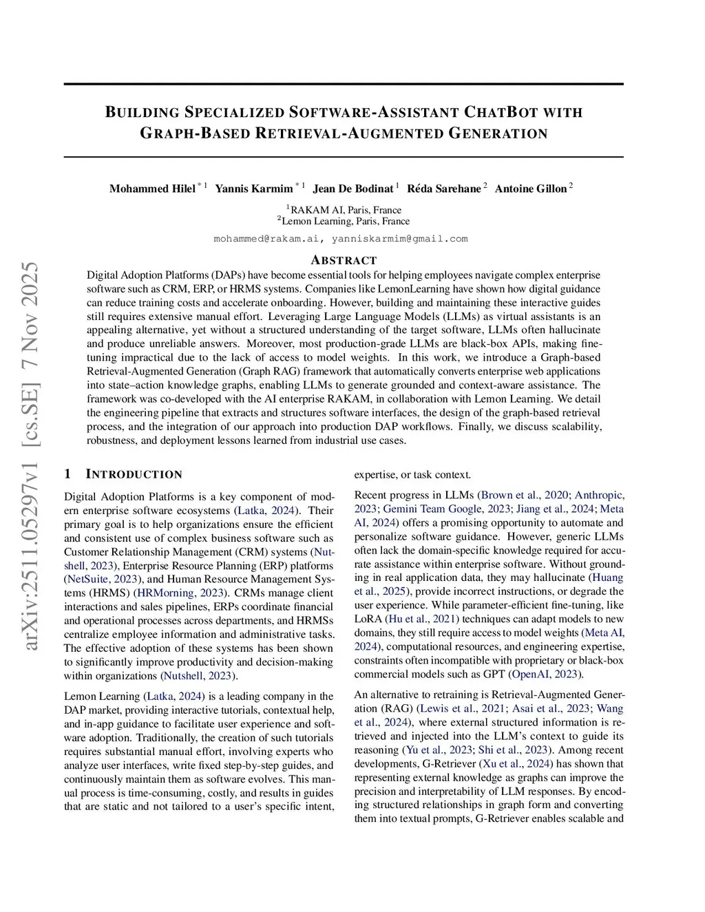 Digital Adoption Platforms (DAPs) have become essential tools for helping employees navigate complex enterprise software such as CRM, ERP, or HRMS systems. Companies like LemonLearning have shown how digital guidance can reduce training costs and accelerate onboarding. However, building and maintaining these interactive guides still requires extensive manual effort. Leveraging Large Language Models as virtual assistants is an appealing alternative, yet without a structured understanding of the target software, LLMs often hallucinate and produce unreliable answers. Moreover, most production-grade LLMs are black-box APIs, making fine-tuning impractical due to the lack of access to model weights. In this work, we introduce a Graph-based Retrieval-Augmented Generation framework that automatically converts enterprise web applications into state-action knowledge graphs, enabling LLMs to generate grounded and context-aware assistance. The framework was co-developed with the AI enterprise RAKAM, in collaboration with Lemon Learning. We detail the engineering pipeline that extracts and structures software interfaces, the design of the graph-based retrieval process, and the integration of our approach into production DAP workflows. Finally, we discuss scalability, robustness, and deployment lessons learned from industrial use cases.