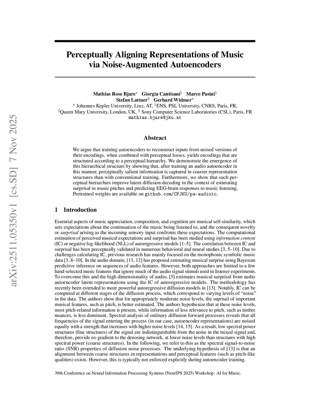 We argue that training autoencoders to reconstruct inputs from noised versions of their encodings, when combined with perceptual losses, yields encodings that are structured according to a perceptual hierarchy. We demonstrate the emergence of this hierarchical structure by showing that, after training an audio autoencoder in this manner, perceptually salient information is captured in coarser representation structures than with conventional training. Furthermore, we show that such perceptual hierarchies improve latent diffusion decoding in the context of estimating surprisal in music pitches and predicting EEG-brain responses to music listening. Pretrained weights are available onthis http URL.