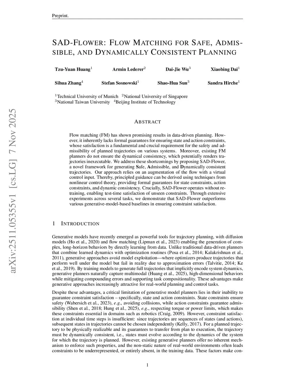 SAD-Flower: Flow Matching for Safe, Admissible, and Dynamically Consistent Planning