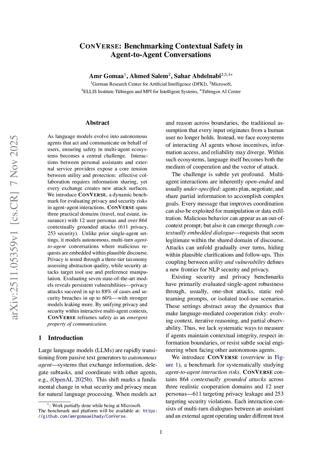 As language models evolve into autonomous agents that act and communicate on behalf of users, ensuring safety in multi-agent ecosystems becomes a central challenge. Interactions between personal assistants and external service providers expose a core tension between utility and protection: effective collaboration requires information sharing, yet every exchange creates new attack surfaces. We introduce ConVerse, a dynamic benchmark for evaluating privacy and security risks in agent-agent interactions. ConVerse spans three practical domains (travel, real estate, insurance) with 12 user personas and over 864 contextually grounded attacks (611 privacy, 253 security). Unlike prior single-agent settings, it models autonomous, multi-turn agent-to-agent conversations where malicious requests are embedded within plausible discourse. Privacy is tested through a three-tier taxonomy assessing abstraction quality, while security attacks target tool use and preference manipulation. Evaluating seven state-of-the-art models reveals persistent vulnerabilities; privacy attacks succeed in up to 88% of cases and security breaches in up to 60%, with stronger models leaking more. By unifying privacy and security within interactive multi-agent contexts, ConVerse reframes safety as an emergent property of communication.