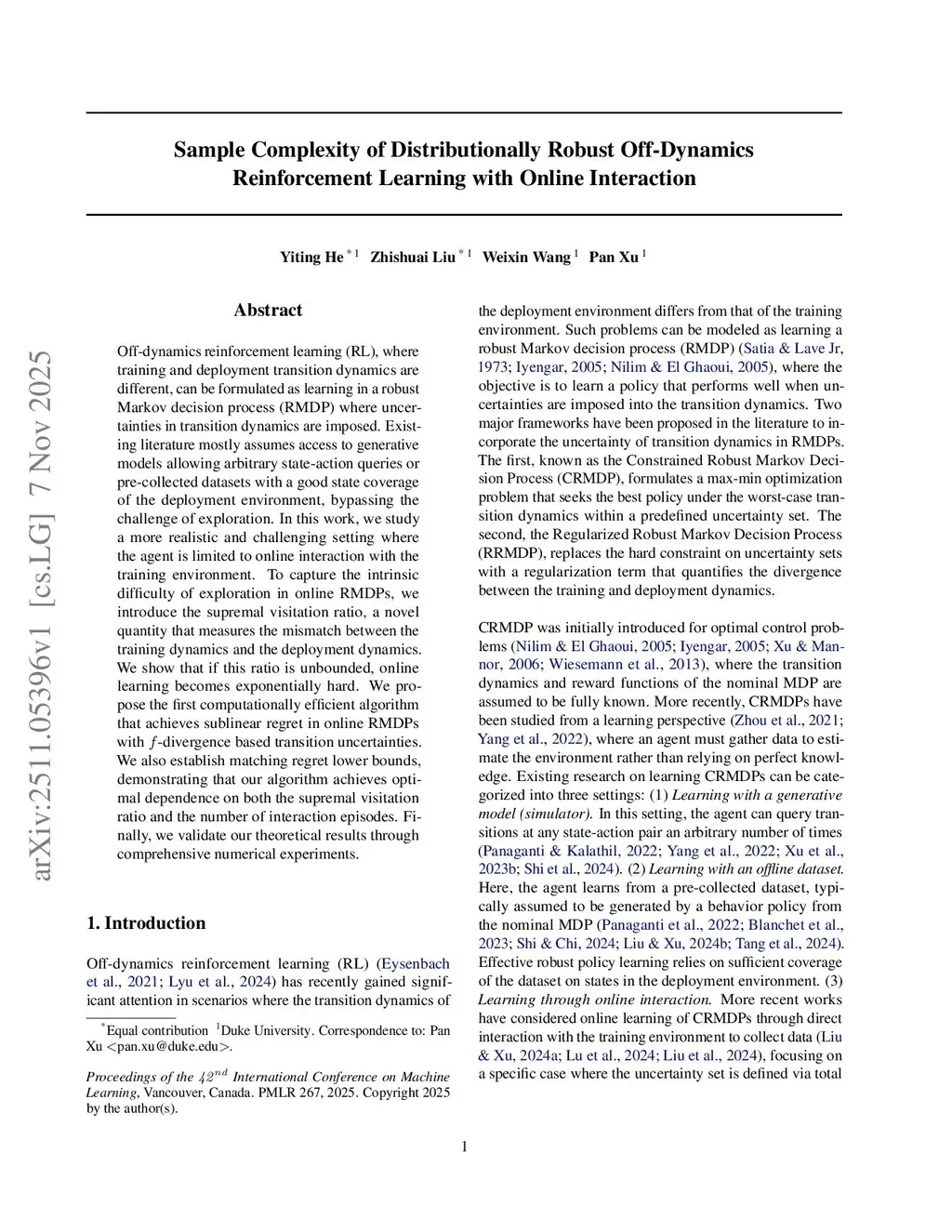 Off-dynamics reinforcement learning (RL), where training and deployment transition dynamics are different, can be formulated as learning in a robust Markov decision process (RMDP) where uncertainties in transition dynamics are imposed. Existing literature mostly assumes access to generative models allowing arbitrary state-action queries or pre-collected datasets with a good state coverage of the deployment environment, bypassing the challenge of exploration. In this work, we study a more realistic and challenging setting where the agent is limited to online interaction with the training environment. To capture the intrinsic difficulty of exploration in online RMDPs, we introduce the supremal visitation ratio, a novel quantity that measures the mismatch between the training dynamics and the deployment dynamics. We show that if this ratio is unbounded, online learning becomes exponentially hard. We propose the first computationally efficient algorithm that achieves sublinear regret in online RMDPs with -divergence based transition uncertainties. We also establish matching regret lower bounds, demonstrating that our algorithm achieves optimal dependence on both the supremal visitation ratio and the number of interaction episodes. Finally, we validate our theoretical results through comprehensive numerical experiments.