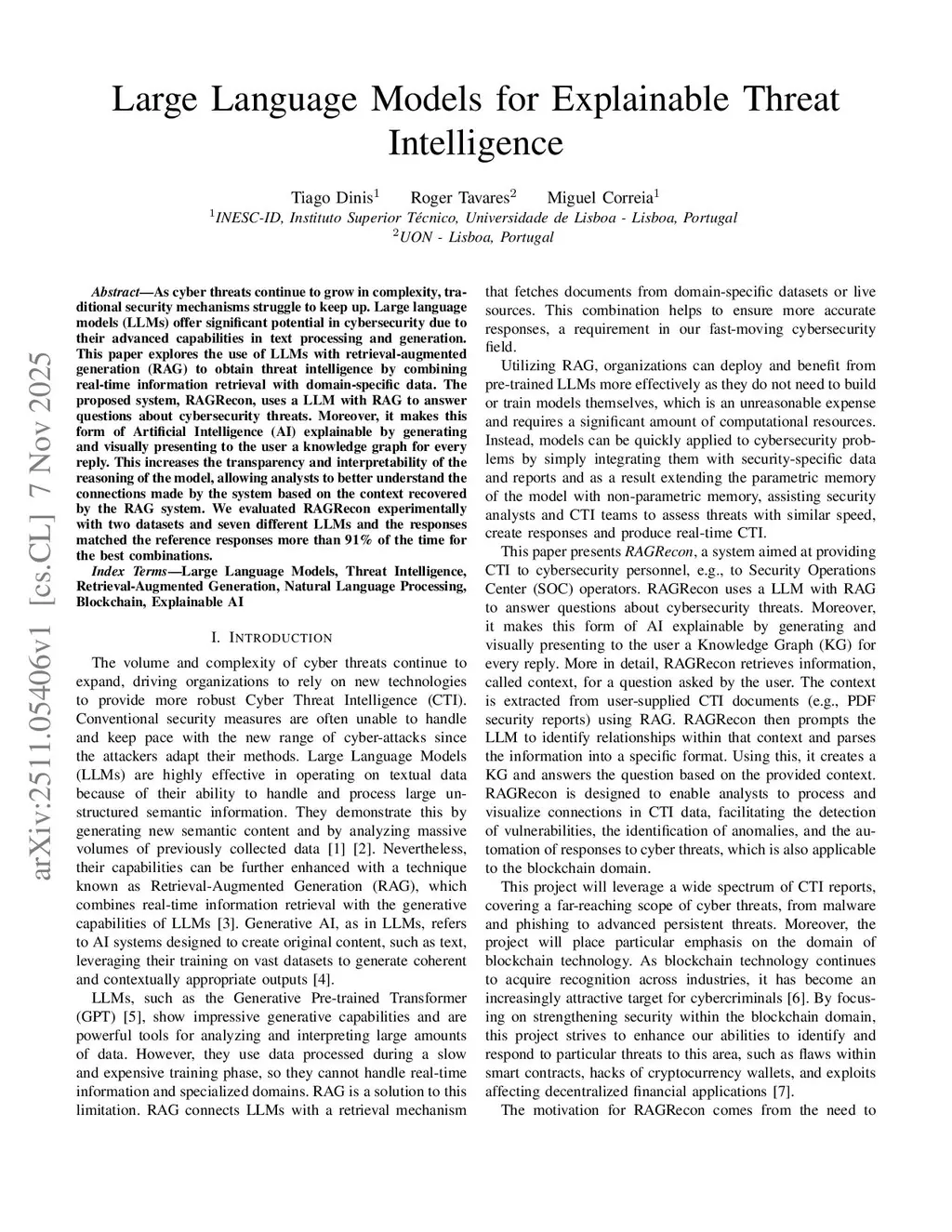 As cyber threats continue to grow in complexity, traditional security mechanisms struggle to keep up. Large language models (LLMs) offer significant potential in cybersecurity due to their advanced capabilities in text processing and generation. This paper explores the use of LLMs with retrieval-augmented generation (RAG) to obtain threat intelligence by combining real-time information retrieval with domain-specific data. The proposed system, RAGRecon, uses a LLM with RAG to answer questions about cybersecurity threats. Moreover, it makes this form of Artificial Intelligence (AI) explainable by generating and visually presenting to the user a knowledge graph for every reply. This increases the transparency and interpretability of the reasoning of the model, allowing analysts to better understand the connections made by the system based on the context recovered by the RAG system. We evaluated RAGRecon experimentally with two datasets and seven different LLMs and the responses matched the reference responses more than 91% of the time for the best combinations.