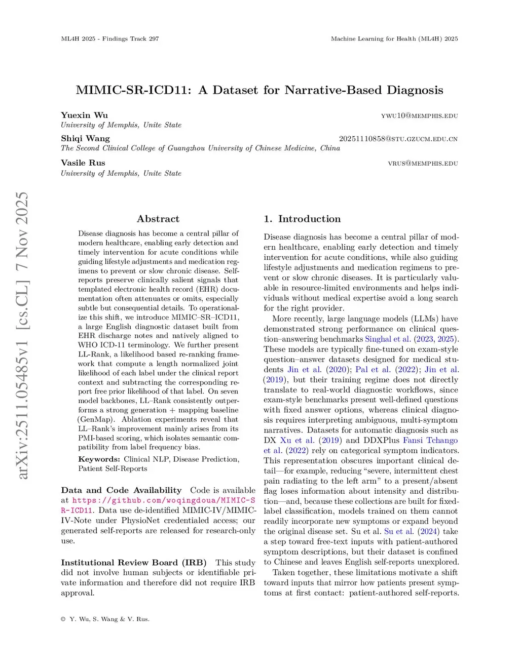 Disease diagnosis is a central pillar of modern healthcare, enabling early detection and timely intervention for acute conditions while guiding lifestyle adjustments and medication regimens to prevent or slow chronic disease. Self-reports preserve clinically salient signals that templated electronic health record (EHR) documentation often attenuates or omits, especially subtle but consequential details. To operationalize this shift, we introduce MIMIC-SR-ICD11, a large English diagnostic dataset built from EHR discharge notes and natively aligned to WHO ICD-11 terminology. We further present LL-Rank, a likelihood-based re-ranking framework that computes a length-normalized joint likelihood of each label given the clinical report context and subtracts the corresponding report-free prior likelihood for that label. Across seven model backbones, LL-Rank consistently outperforms a strong generation-plus-mapping baseline (GenMap). Ablation experiments show that LL-Rank's gains primarily stem from its PMI-based scoring, which isolates semantic compatibility from label frequency bias.