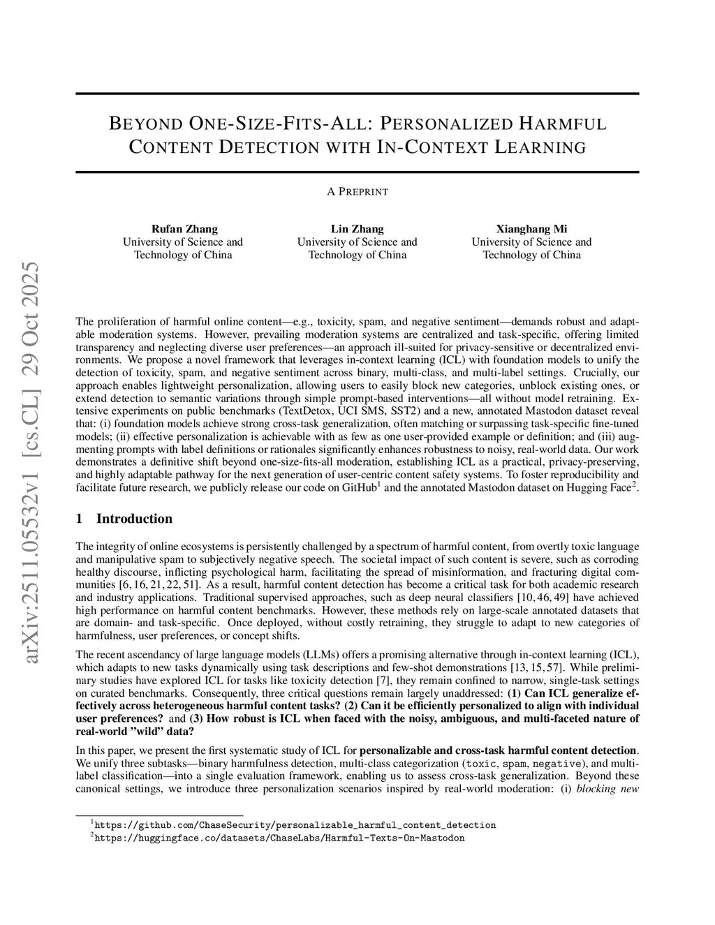 The proliferation of harmful online content--e.g., toxicity, spam, and negative sentiment--demands robust and adaptable moderation systems. However, prevailing moderation systems are centralized and task-specific, offering limited transparency and neglecting diverse user preferences--an approach ill-suited for privacy-sensitive or decentralized environments. We propose a novel framework that leverages in-context learning (ICL) with foundation models to unify the detection of toxicity, spam, and negative sentiment across binary, multi-class, and multi-label settings. Crucially, our approach enables lightweight personalization, allowing users to easily block new categories, unblock existing ones, or extend detection to semantic variations through simple prompt-based interventions--all without model retraining. Extensive experiments on public benchmarks (TextDetox, UCI SMS, SST2) and a new, annotated Mastodon dataset reveal that: (i) foundation models achieve strong cross-task generalization, often matching or surpassing task-specific fine-tuned models; (ii) effective personalization is achievable with as few as one user-provided example or definition; and (iii) augmenting prompts with label definitions or rationales significantly enhances robustness to noisy, real-world data. Our work demonstrates a definitive shift beyond one-size-fits-all moderation, establishing ICL as a practical, privacy-preserving, and highly adaptable pathway for the next generation of user-centric content safety systems. To foster reproducibility and facilitate future research, we publicly release our code on GitHub and the annotated Mastodon dataset on Hugging Face.