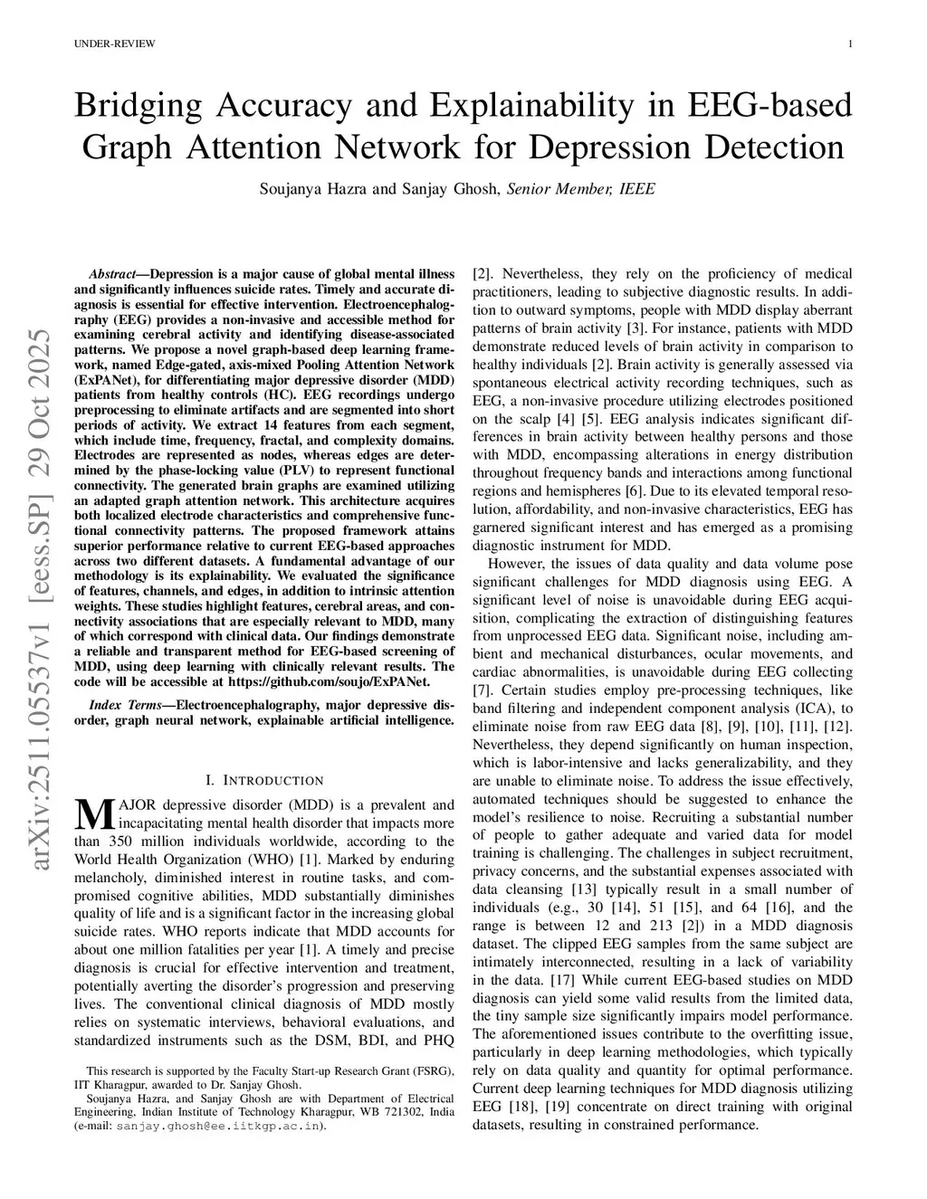 Depression is a major cause of global mental illness and significantly influences suicide rates. Timely and accurate diagnosis is essential for effective intervention. Electroencephalography (EEG) provides a non-invasive and accessible method for examining cerebral activity and identifying disease-associated patterns. We propose a novel graph-based deep learning framework, named Edge-gated, axis-mixed Pooling Attention Network (ExPANet), for differentiating major depressive disorder (MDD) patients from healthy controls (HC). EEG recordings undergo preprocessing to eliminate artifacts and are segmented into short periods of activity. We extract 14 features from each segment, which include time, frequency, fractal, and complexity domains. Electrodes are represented as nodes, whereas edges are determined by the phase-locking value (PLV) to represent functional connectivity. The generated brain graphs are examined utilizing an adapted graph attention network. This architecture acquires both localized electrode characteristics and comprehensive functional connectivity patterns. The proposed framework attains superior performance relative to current EEG-based approaches across two different datasets. A fundamental advantage of our methodology is its explainability. We evaluated the significance of features, channels, and edges, in addition to intrinsic attention weights. These studies highlight features, cerebral areas, and connectivity associations that are especially relevant to MDD, many of which correspond with clinical data. Our findings demonstrate a reliable and transparent method for EEG-based screening of MDD, using deep learning with clinically relevant results.