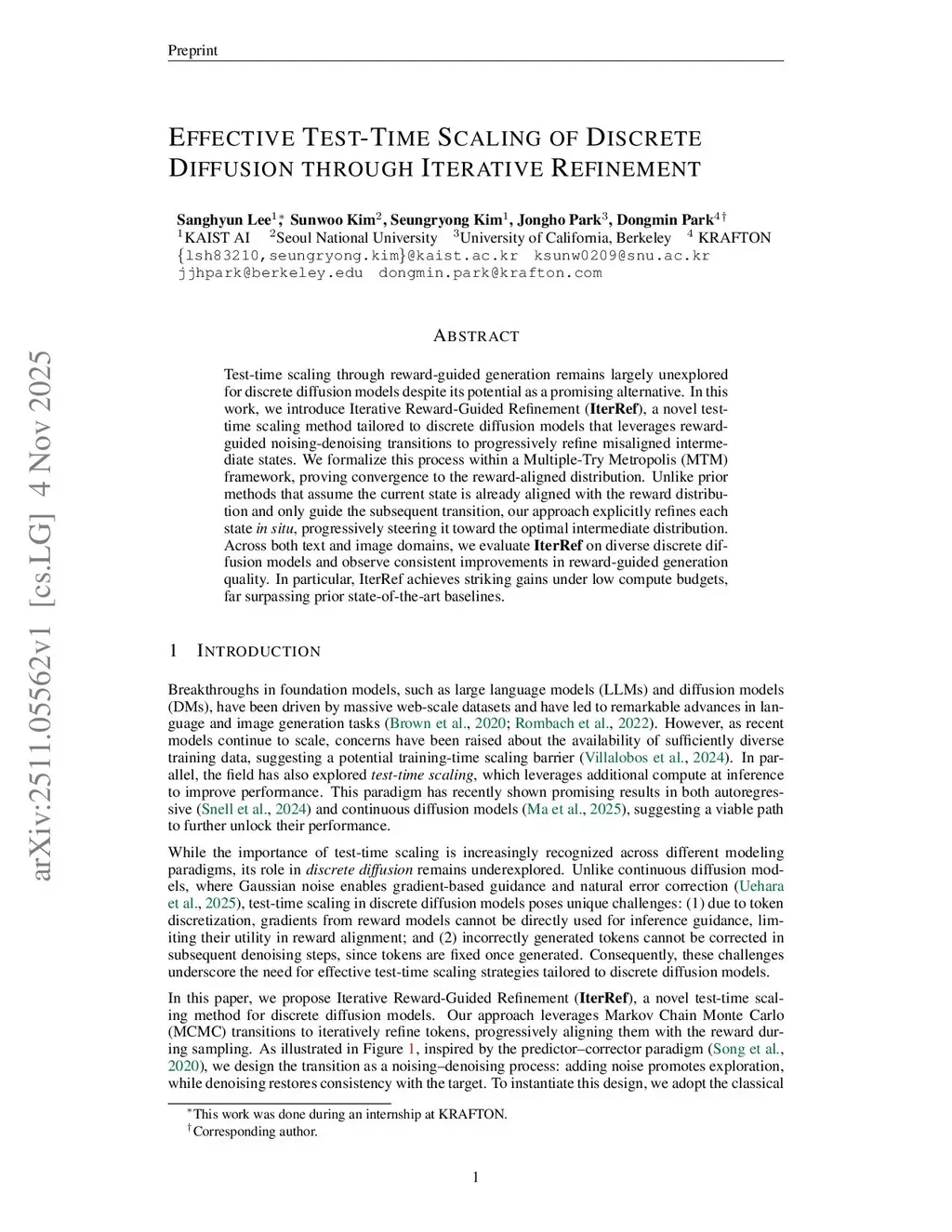 Test-time scaling through reward-guided generation remains largely unexplored for discrete diffusion models despite its potential as a promising alternative. In this work, we introduce Iterative Reward-Guided Refinement (IterRef), a novel test-time scaling method tailored to discrete diffusion that leverages reward- guided noising-denoising transitions to progressively refine misaligned intermediate states. We formalize this process within a Multiple-Try Metropolis (MTM) framework, proving convergence to the reward-aligned distribution. Unlike prior methods that assume the current state is already aligned with the reward distribution and only guide the subsequent transition, our approach explicitly refines each state in situ, progressively steering it toward the optimal intermediate distribution. Across both text and image domains, we evaluate IterRef on diverse discrete diffusion models and observe consistent improvements in reward-guided generation quality. In particular, IterRef achieves striking gains under low compute budgets, far surpassing prior state-of-the-art baselines.