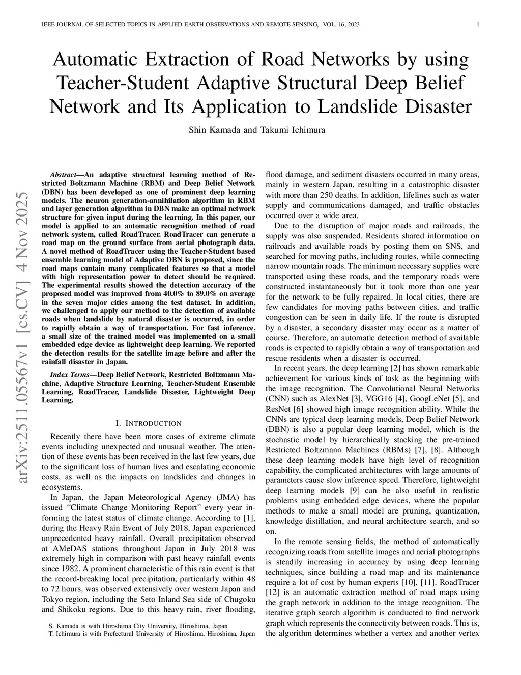 Automatic Extraction of Road Networks by using Teacher-Student Adaptive Structural Deep Belief Network and Its Application to Landslide Disaster