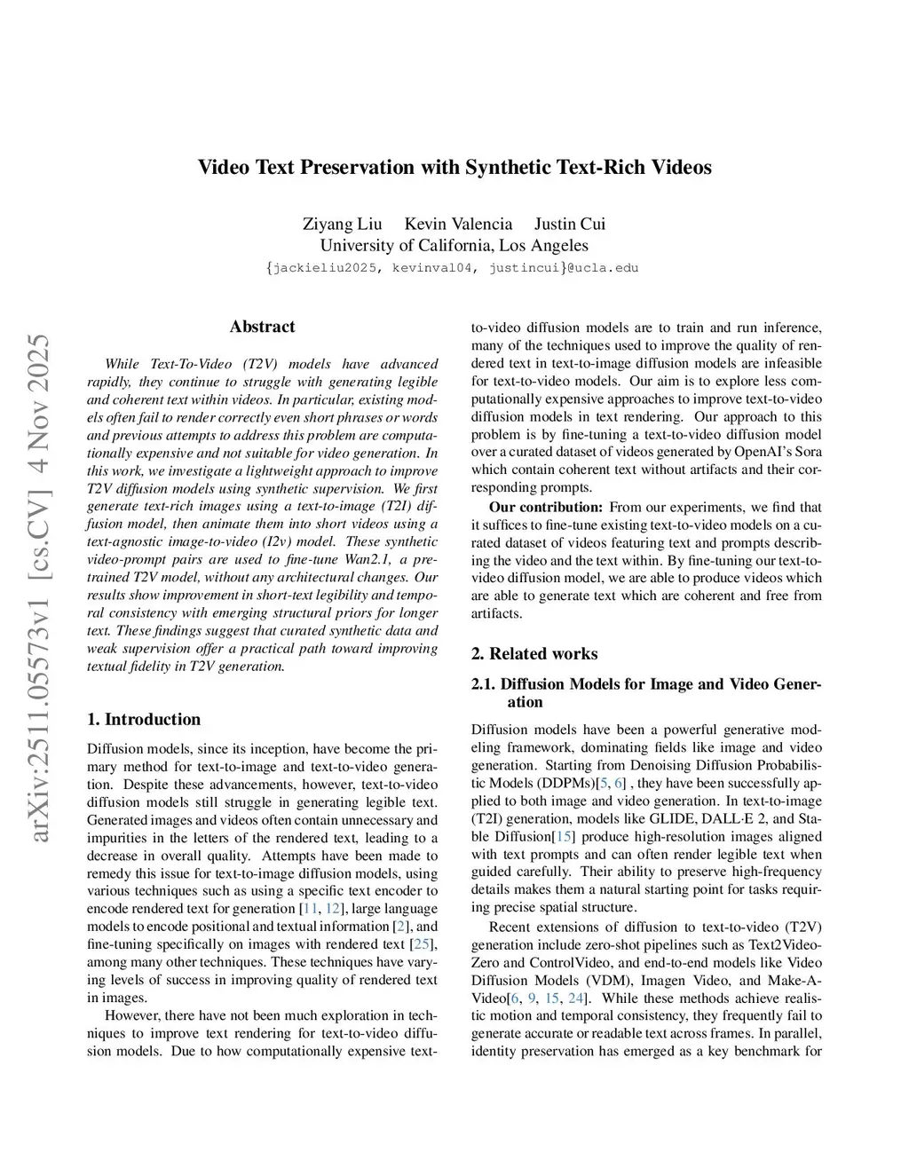 While Text-To-Video (T2V) models have advanced rapidly, they continue to struggle with generating legible and coherent text within videos. In particular, existing models often fail to render correctly even short phrases or words and previous attempts to address this problem are computationally expensive and not suitable for video generation. In this work, we investigate a lightweight approach to improve T2V diffusion models using synthetic supervision. We first generate text-rich images using a text-to-image (T2I) diffusion model, then animate them into short videos using a text-agnostic image-to-video (I2v) model. These synthetic video-prompt pairs are used to fine-tune Wan2.1, a pre-trained T2V model, without any architectural changes. Our results show improvement in short-text legibility and temporal consistency with emerging structural priors for longer text. These findings suggest that curated synthetic data and weak supervision offer a practical path toward improving textual fidelity in T2V generation.