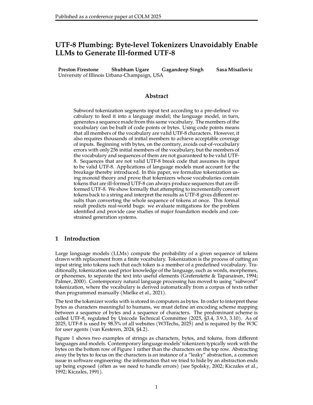Subword tokenization segments input text according to a pre-defined vocabulary to feed it into a language model; the language model, in turn, generates a sequence made from this same vocabulary. The members of the vocabulary can be built of code points or bytes. Using code points means that all members of the vocabulary are valid UTF-8 characters. However, it also requires thousands of initial members to achieve acceptable coverage of inputs. Beginning with bytes, on the contrary, avoids out-of-vocabulary errors with only 256 initial members of the vocabulary, but the members of the vocabulary and sequences of them are not guaranteed to be valid UTF-8. Sequences that are not valid UTF-8 break code that assumes its input to be valid UTF-8. Applications of language models must account for the breakage thereby introduced. In this paper, we formalize tokenization using monoid theory and prove that tokenizers whose vocabularies contain tokens that are ill-formed UTF-8 can always produce sequences that are ill-formed UTF-8. We demonstrate formally that attempting to incrementally convert tokens back to a string and interpret the results as UTF-8 gives different results than converting the whole sequence of tokens at once. This formal result predicts real-world bugs: we evaluate mitigations for the problem identified and provide case studies of major foundation models, serving engines, and constrained generation systems.