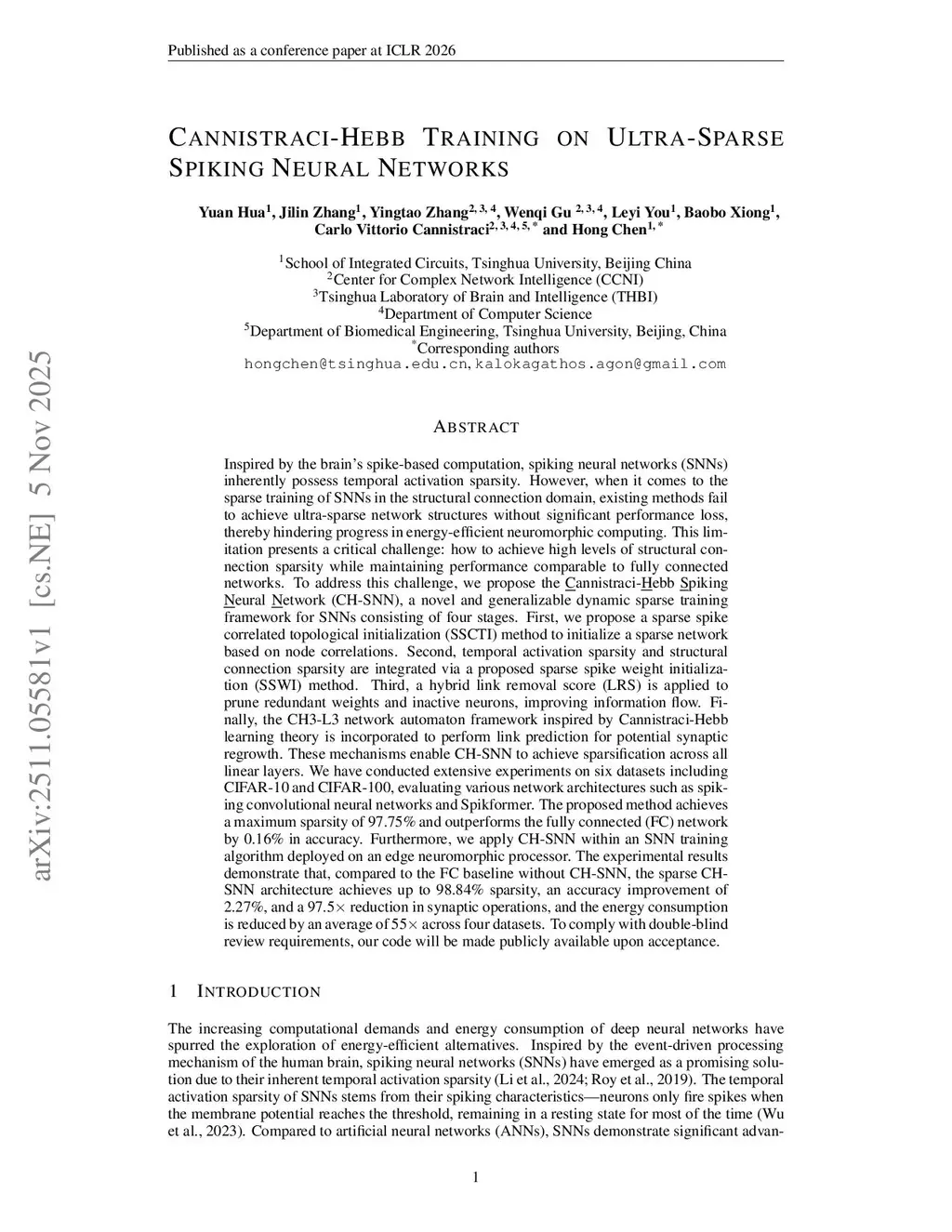 Inspired by the brain's spike-based computation, spiking neural networks (SNNs) inherently possess temporal activation sparsity. However, when it comes to the sparse training of SNNs in the structural connection domain, existing methods fail to achieve ultra-sparse network structures without significant performance loss, thereby hindering progress in energy-efficient neuromorphic computing. This limitation presents a critical challenge: how to achieve high levels of structural connection sparsity while maintaining performance comparable to fully connected networks. To address this challenge, we propose the Cannistraci-Hebb Spiking Neural Network (CH-SNN), a novel and generalizable dynamic sparse training framework for SNNs consisting of four stages. First, we propose a sparse spike correlated topological initialization (SSCTI) method to initialize a sparse network based on node correlations. Second, temporal activation sparsity and structural connection sparsity are integrated via a proposed sparse spike weight initialization (SSWI) method. Third, a hybrid link removal score (LRS) is applied to prune redundant weights and inactive neurons, improving information flow. Finally, the CH3-L3 network automaton framework inspired by Cannistraci-Hebb learning theory is incorporated to perform link prediction for potential synaptic regrowth. These mechanisms enable CH-SNN to achieve sparsification across all linear layers. We have conducted extensive experiments on six datasets including CIFAR-10 and CIFAR-100, evaluating various network architectures such as spiking convolutional neural networks and Spikformer.