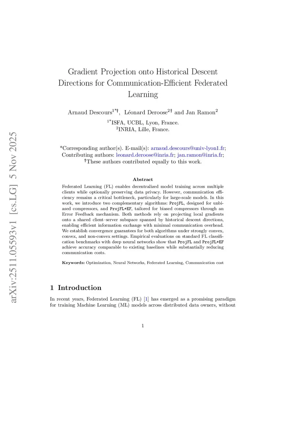 Federated Learning (FL) enables decentralized model training across multiple clients while optionally preserving data privacy. However, communication efficiency remains a critical bottleneck, particularly for large-scale models. In this work, we introduce two complementary algorithms: ProjFL, designed for unbiased compressors, and ProjFL+EF, tailored for biased compressors through an Error Feedback mechanism. Both methods rely on projecting local gradients onto a shared client-server subspace spanned by historical descent directions, enabling efficient information exchange with minimal communication overhead. We establish convergence guarantees for both algorithms under strongly convex, convex, and non-convex settings. Empirical evaluations on standard FL classification benchmarks with deep neural networks show that ProjFL and ProjFL+EF achieve accuracy comparable to existing baselines while substantially reducing communication costs.