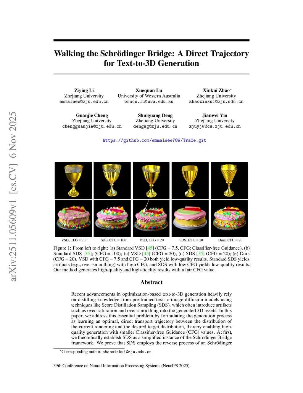 Recent advancements in optimization-based text-to-3D generation heavily rely on distilling knowledge from pre-trained text-to-image diffusion models using techniques like Score Distillation Sampling (SDS), which often introduce artifacts such as over-saturation and over-smoothing into the generated 3D assets. In this paper, we address this essential problem by formulating the generation process as learning an optimal, direct transport trajectory between the distribution of the current rendering and the desired target distribution, thereby enabling high-quality generation with smaller Classifier-free Guidance (CFG) values. At first, we theoretically establish SDS as a simplified instance of the Schrödinger Bridge framework. We prove that SDS employs the reverse process of an Schrödinger Bridge, which, under specific conditions (e.g., a Gaussian noise as one end), collapses to SDS's score function of the pre-trained diffusion model. Based upon this, we introduce Trajectory-Centric Distillation (TraCe), a novel text-to-3D generation framework, which reformulates the mathematically trackable framework of Schrödinger Bridge to explicitly construct a diffusion bridge from the current rendering to its text-conditioned, denoised target, and trains a LoRA-adapted model on this trajectory's score dynamics for robust 3D optimization. Comprehensive experiments demonstrate that TraCe consistently achieves superior quality and fidelity to state-of-the-art techniques.