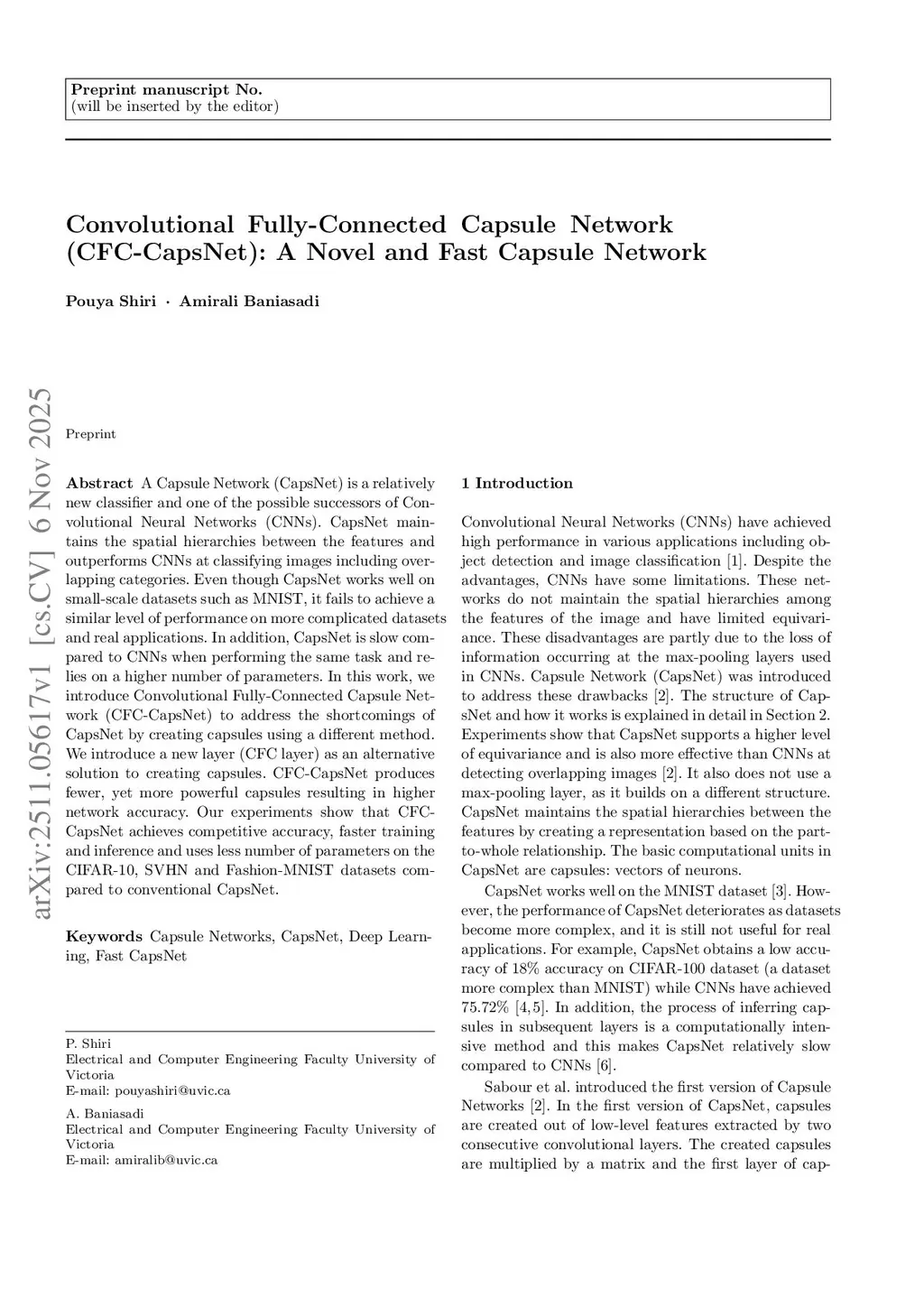Convolutional Fully-Connected Capsule Network (CFC-CapsNet): A Novel and Fast Capsule Network