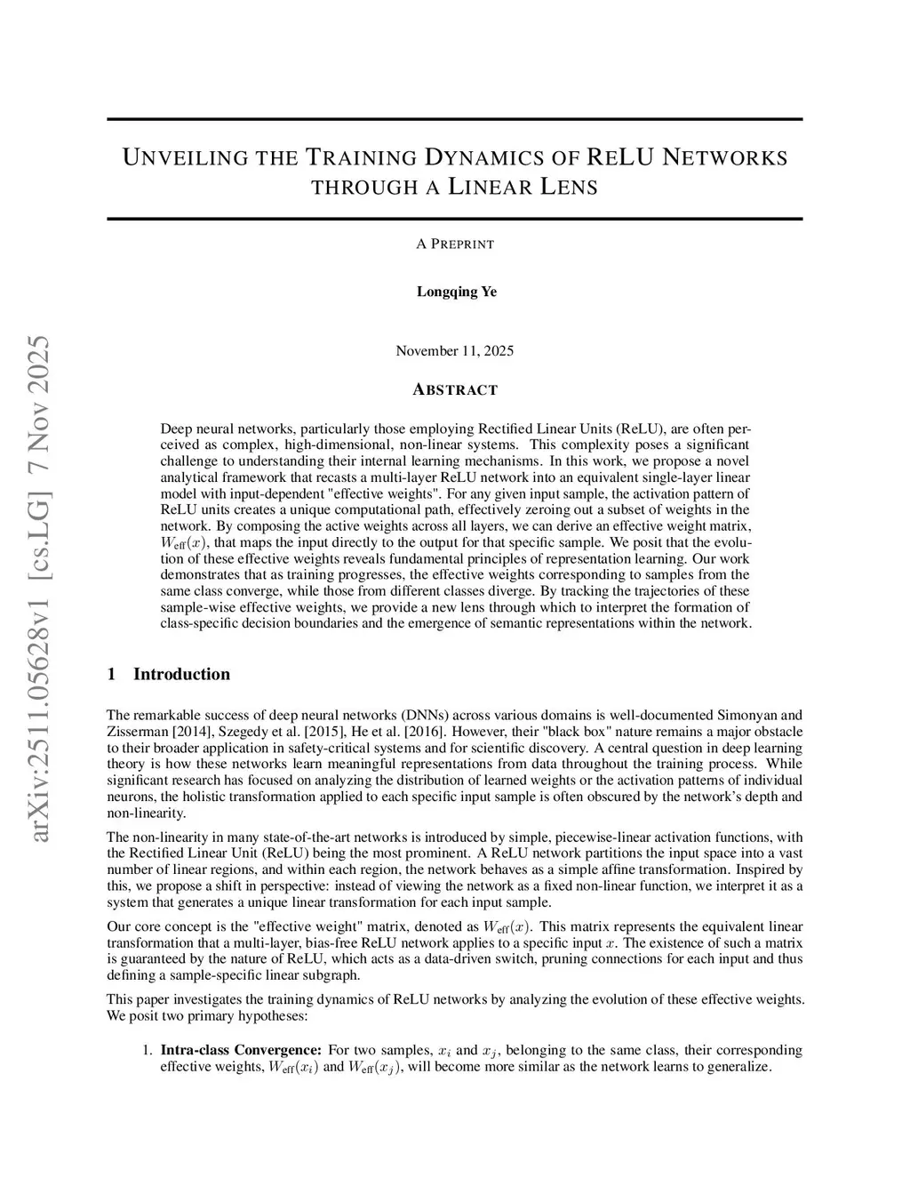 Deep neural networks, particularly those employing Rectified Linear Units (ReLU), are often perceived as complex, high-dimensional, non-linear systems. This complexity poses a significant challenge to understanding their internal learning mechanisms. In this work, we propose a novel analytical framework that recasts a multi-layer ReLU network into an equivalent single-layer linear model with input-dependent "effective weights". For any given input sample, the activation pattern of ReLU units creates a unique computational path, effectively zeroing out a subset of weights in the network. By composing the active weights across all layers, we can derive an effective weight matrix, , that maps the input directly to the output for that specific sample. We posit that the evolution of these effective weights reveals fundamental principles of representation learning. Our work demonstrates that as training progresses, the effective weights corresponding to samples from the same class converge, while those from different classes diverge. By tracking the trajectories of these sample-wise effective weights, we provide a new lens through which to interpret the formation of class-specific decision boundaries and the emergence of semantic representations within the network.