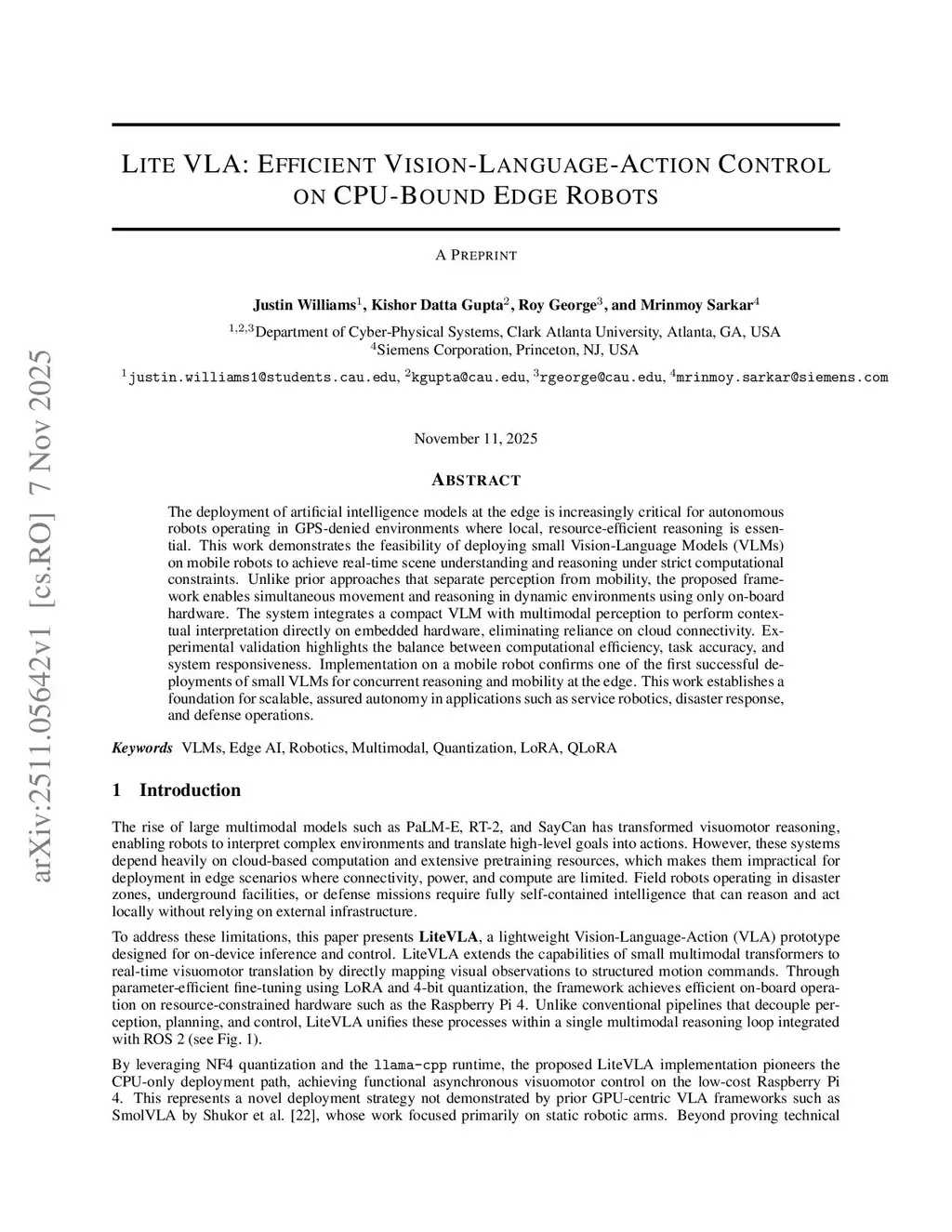 Lite VLA: Efficient Vision-Language-Action Control on CPU-Bound Edge Robots