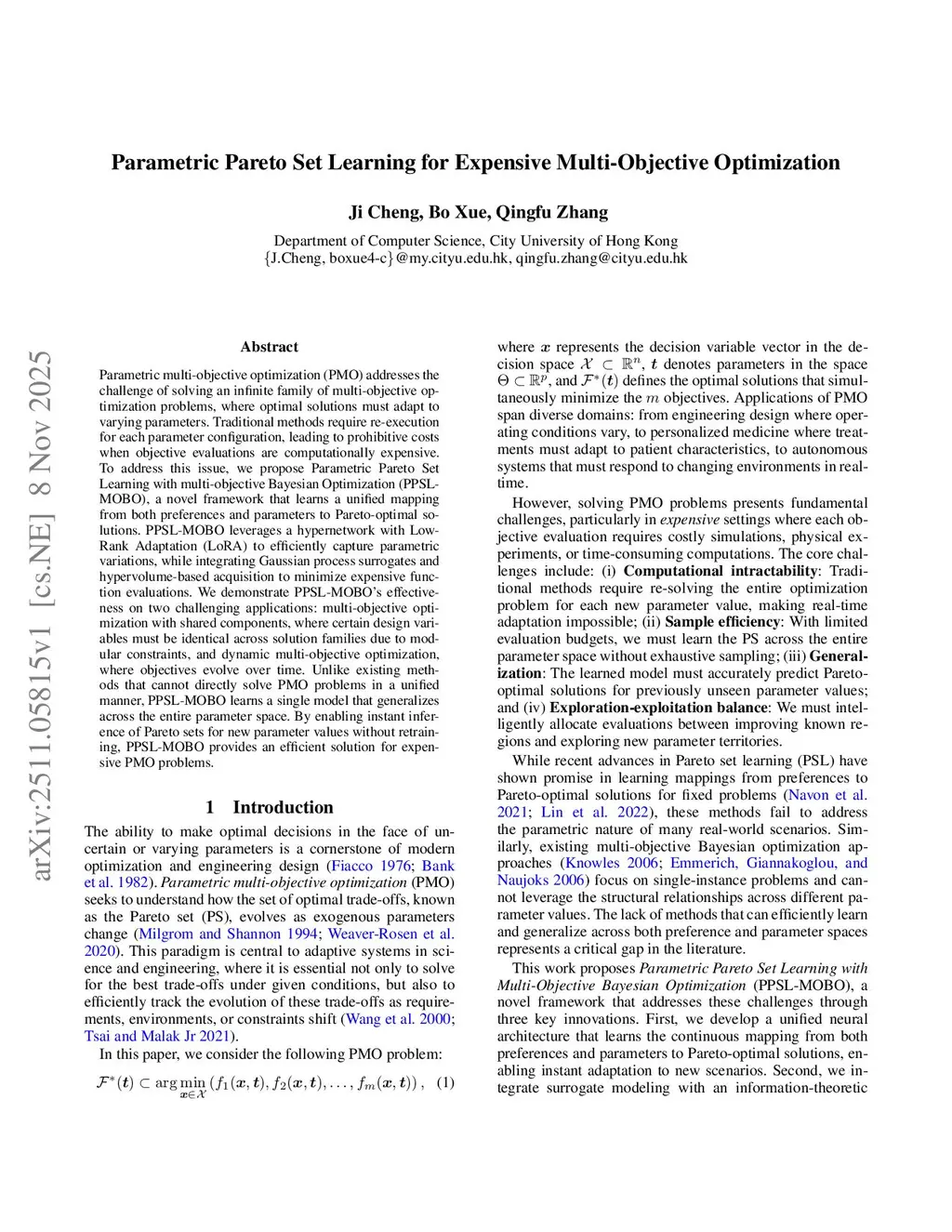 Parametric multi-objective optimization (PMO) addresses the challenge of solving an infinite family of multi-objective optimization problems, where optimal solutions must adapt to varying parameters. Traditional methods require re-execution for each parameter configuration, leading to prohibitive costs when objective evaluations are computationally expensive. To address this issue, we propose Parametric Pareto Set Learning with multi-objective Bayesian Optimization (PPSL-MOBO), a novel framework that learns a unified mapping from both preferences and parameters to Pareto-optimal solutions. PPSL-MOBO leverages a hypernetwork with Low-Rank Adaptation (LoRA) to efficiently capture parametric variations, while integrating Gaussian process surrogates and hypervolume-based acquisition to minimize expensive function evaluations. We demonstrate PPSL-MOBO's effectiveness on two challenging applications: multi-objective optimization with shared components, where certain design variables must be identical across solution families due to modular constraints, and dynamic multi-objective optimization, where objectives evolve over time. Unlike existing methods that cannot directly solve PMO problems in a unified manner, PPSL-MOBO learns a single model that generalizes across the entire parameter space. By enabling instant inference of Pareto sets for new parameter values without retraining, PPSL-MOBO provides an efficient solution for expensive PMO problems.