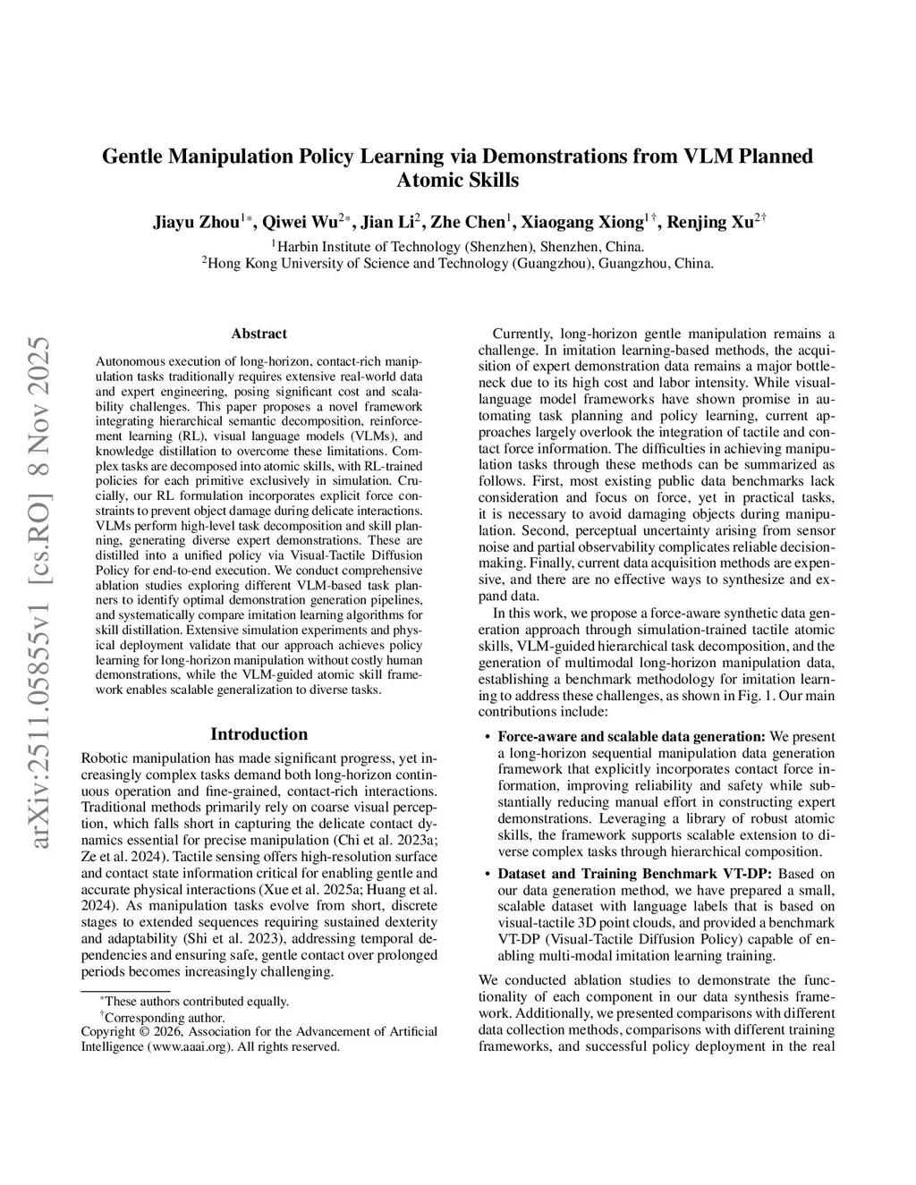Gentle Manipulation Policy Learning via Demonstrations from VLM Planned Atomic Skills